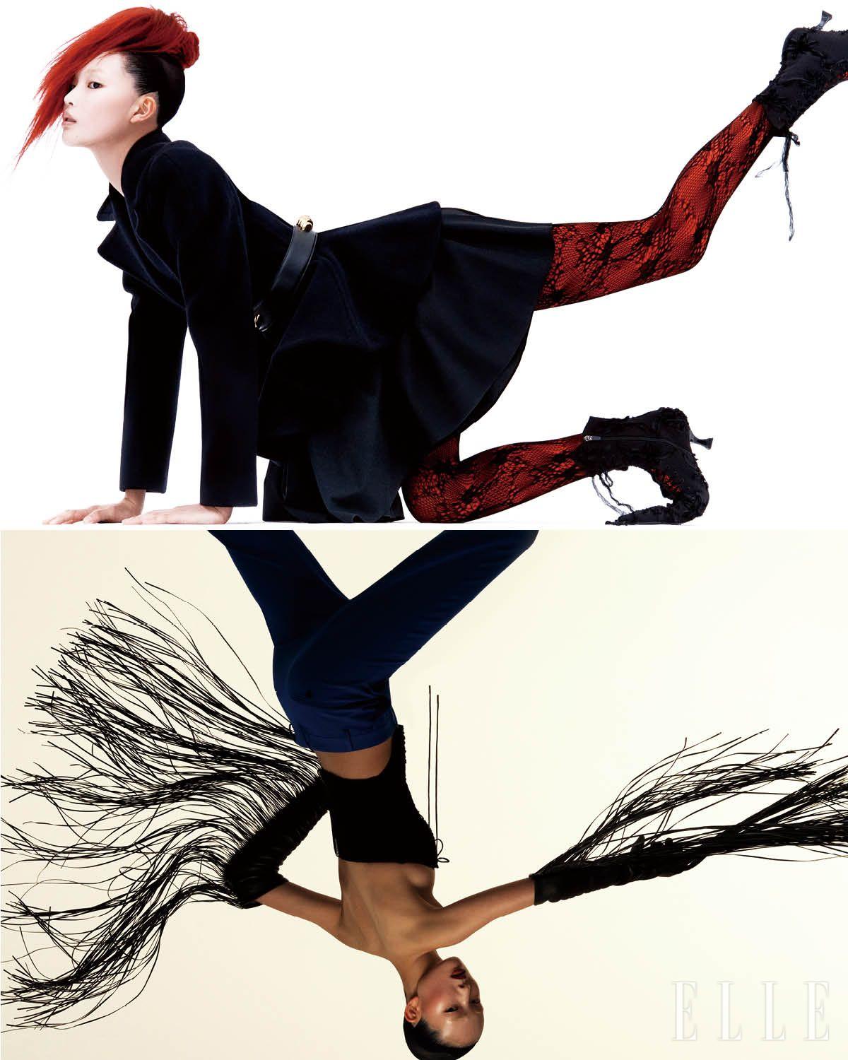 (위) 재킷은 7백98만원, 미니드레스는 5백75만원, 메탈 장식이 달린 벨트는 5백75만원, 모두 Alaïa. 포인티드 토 레이스업 부츠는 82만원, Gyouree Kim. 스타킹은 에디터 소장품. (아래) 코르셋 톱은 가격 미정, Markgong. 팬츠는 1백75만원, Celine. 프린지 디테일의 레더 장갑은 가격 미정, Sportmax.