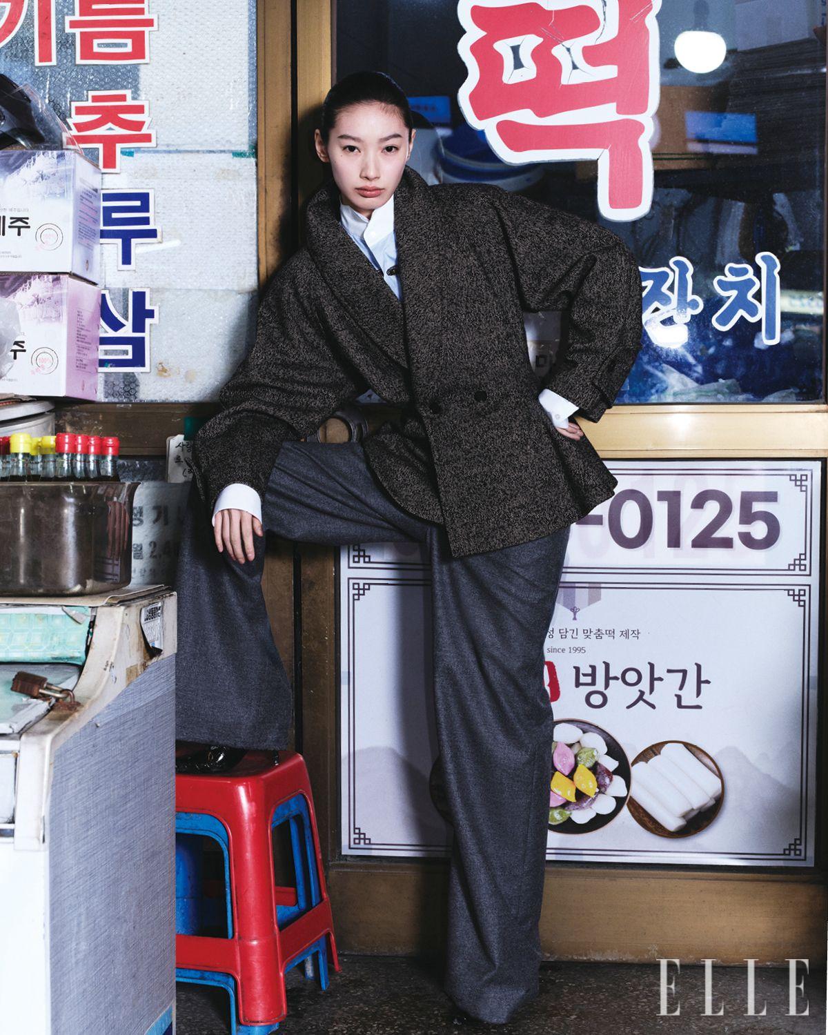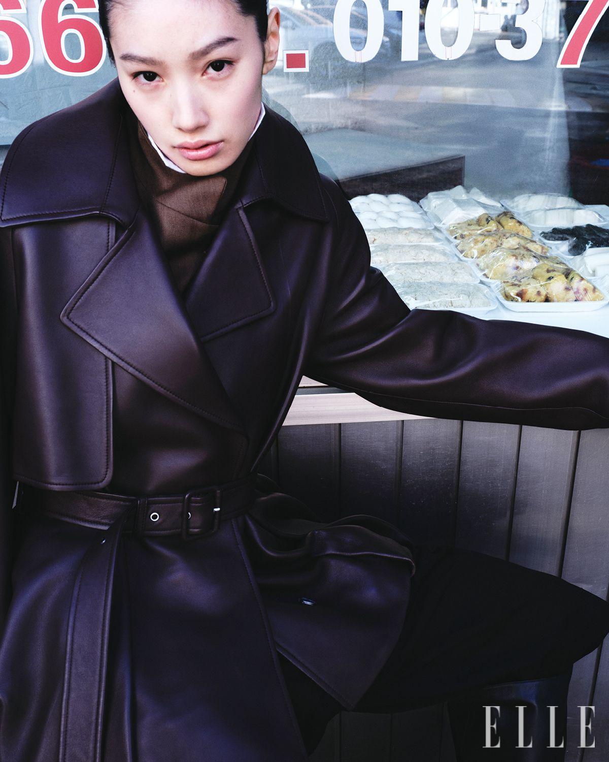 풍성한 드레이프와 벨트가 특징인 램스킨 재킷은 1천1백80만원, Loewe. 레이어드한 하이넥 해링본 재킷은 가격 미정, Nehera. 화이트 셔츠는 가격 미정, Ralph Lauren Collection. 크롭트 팬츠는 가격 미정, The Row.부츠는 2백65만원, Ferragamo.