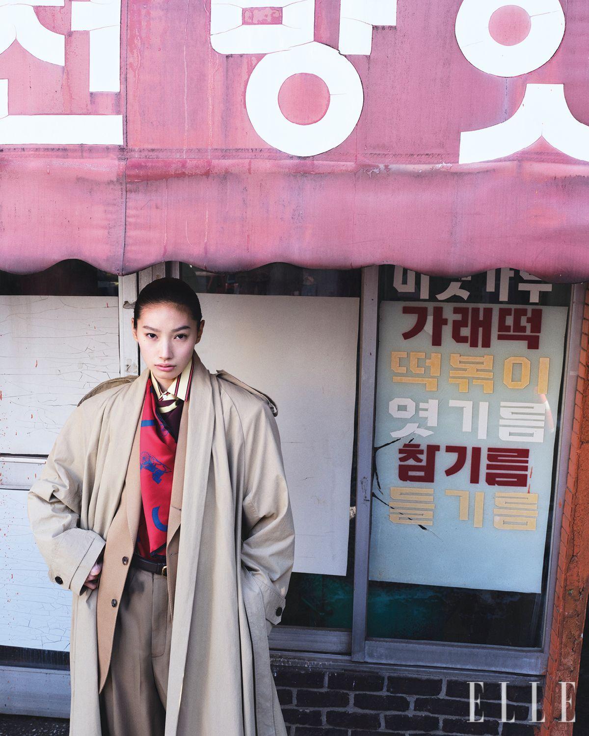스트라이프 패턴의 실크 셔츠와 톱으로 연출한 컬러플한 실크 스카프, 베이지색 울 재킷과 팬츠는 가격 미정, 모두 Celine. 오버사이즈 트렌치코트는 가격 미정, Gia Studios by 10 Corso Como Seoul. 벨트는 1백1만원, Gucci.