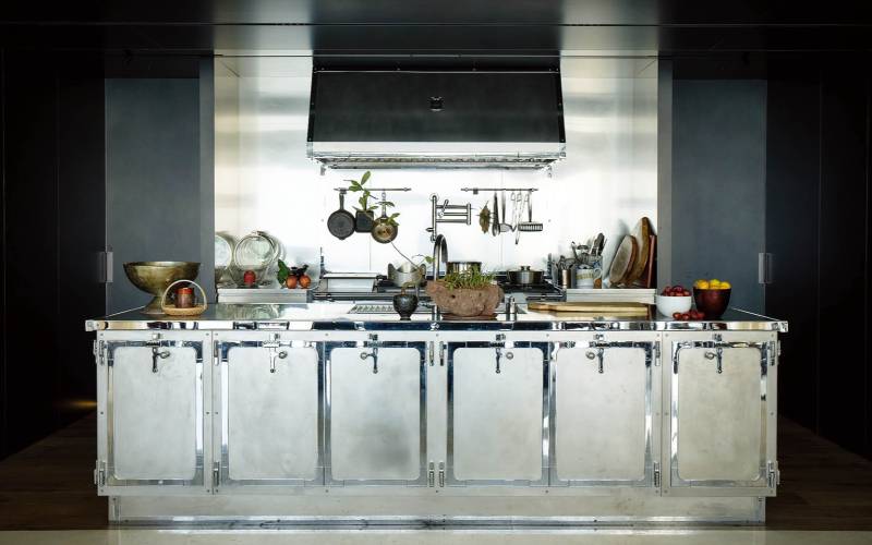 “크고 기능적인 부엌을 만들겠다는 일념이 있었어요. 최소의 규격으로 최대한의 공간을 활용한다는 목표로 설계된 프랑크푸르트 키친에서 아이디어를 얻었죠.” 그는 작은 체구를 지닌 자신의 신체 사이즈에 맞춰 동선을 설계하고, 주방 가구의 경우 수입 무늬목과 스테인리스스틸 등 자재 하나하나를 직접 골라 사제 업체에 제작을 맡겼다.