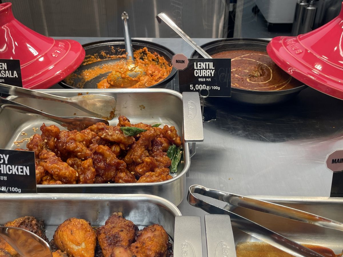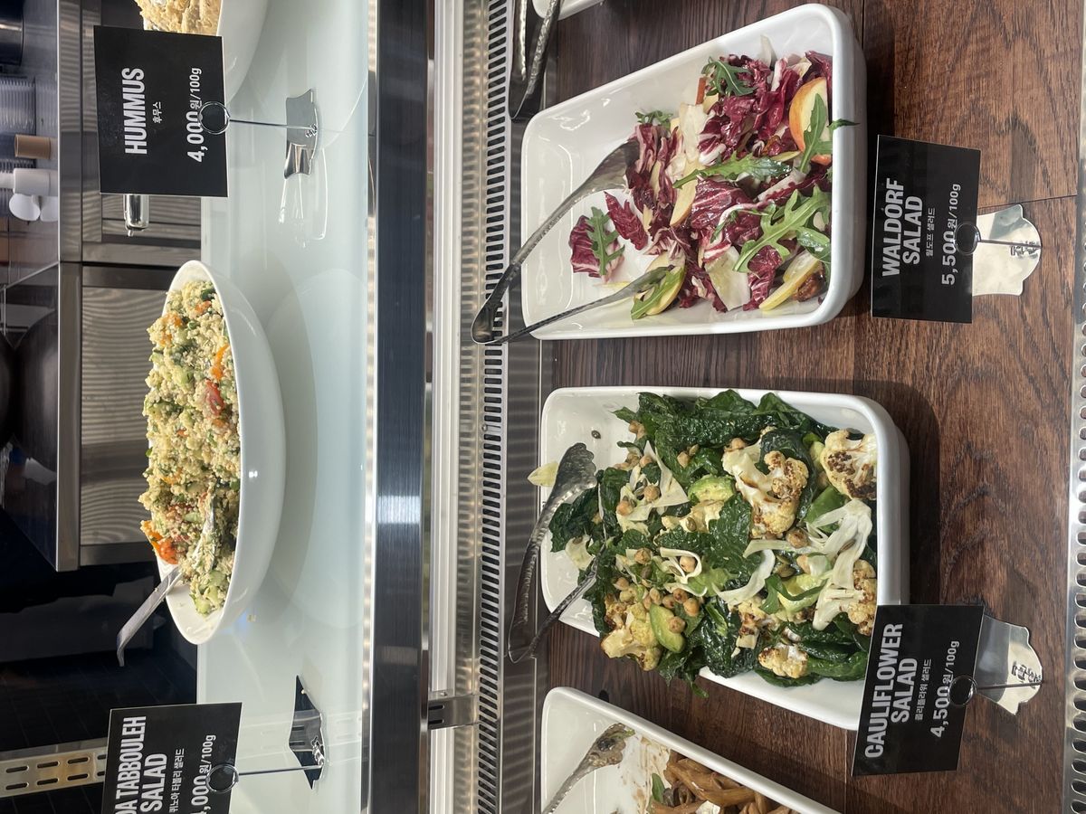 」델리 코너도 기대 이상입니다. 메뉴 퀄리티가 여느 유명한 브런치 카페나 호텔 조식 뷔페를 능가하죠. 100g 단위로 가격을 책정해 부담 없이 여러 가지를 맛볼 수 있는 구조도 영리합니다. 아보카도 케일 샐러드, 콜리플라워 샐러드, 퀴노아 타볼리, 후무스 등 선택지가 폭넓어 접시를 채우는 재미가 큽니다. 가지 라자냐와 연어 스테이크 역시 완성도가 높아, 간단히 고른 한 접시로도 호텔 레스토랑 무드를 연출할 수 있습니다.