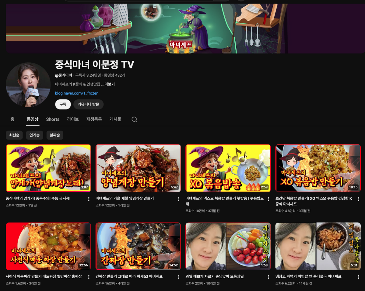 시즌 1 중식 여신 정지선 셰프에 이어 이번 시즌에도 여성 중식 셰프가 등장했습니다. ‘웍으로 마술을 부리는 아줌마’라고 자신을 소개한 중식마녀, 이문정 셰프가 그 주인공입니다. 이 소개 멘트는 방송 출연 전부터 확립한 주요 콘셉트였어요. 2020년부터 꾸준히 400개가 넘는 요리 영상을 업로드 해온 그는 항상 고정 댓글로 “웍으로 마술을 부리는 아줌마, 마녀셰프 인사 올립니다”라고 적어두곤 했죠. 채널에는 요리 영상 뿐 아니라 그가 직접 작곡한 레시피 노래들도 가득한데요. 방송 속 프로페셔널해보이던 모습과 달리 유튜브 영상은 투박한 편집 실력과 더불어 약간은 허당끼가 느껴지는 것이 흥미를 유발합니다. 이문정 셰프는 댓글을 통해 “유튜브가 너무 하고 싶어서 5년 전 세종사이버대학교 입학한 유튜버학과 1기 졸업생”이라고 설명하기도 헀는데요. 국가 공인 조리 기능장과 박사 학위가 있음에도 유튜브에 진심인 모습이 반전 매력의 핵심 포인트로 보이네요. 그의 편집 센스는, 말로 표현하기가 어려운데요. 유튜브 채널에 방문해서 영상 몇 편 살펴보다 보면 알 수 없는(?) 마녀의 매력에 푹 빠지게 될 거예요.
