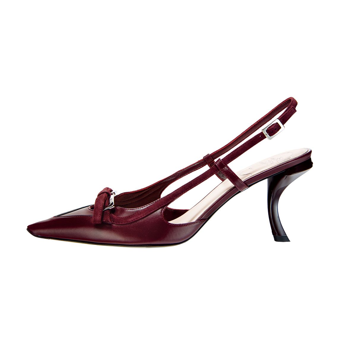 리본 디테일의 버건디 슬링백은 가격 미정, Roger vivier.