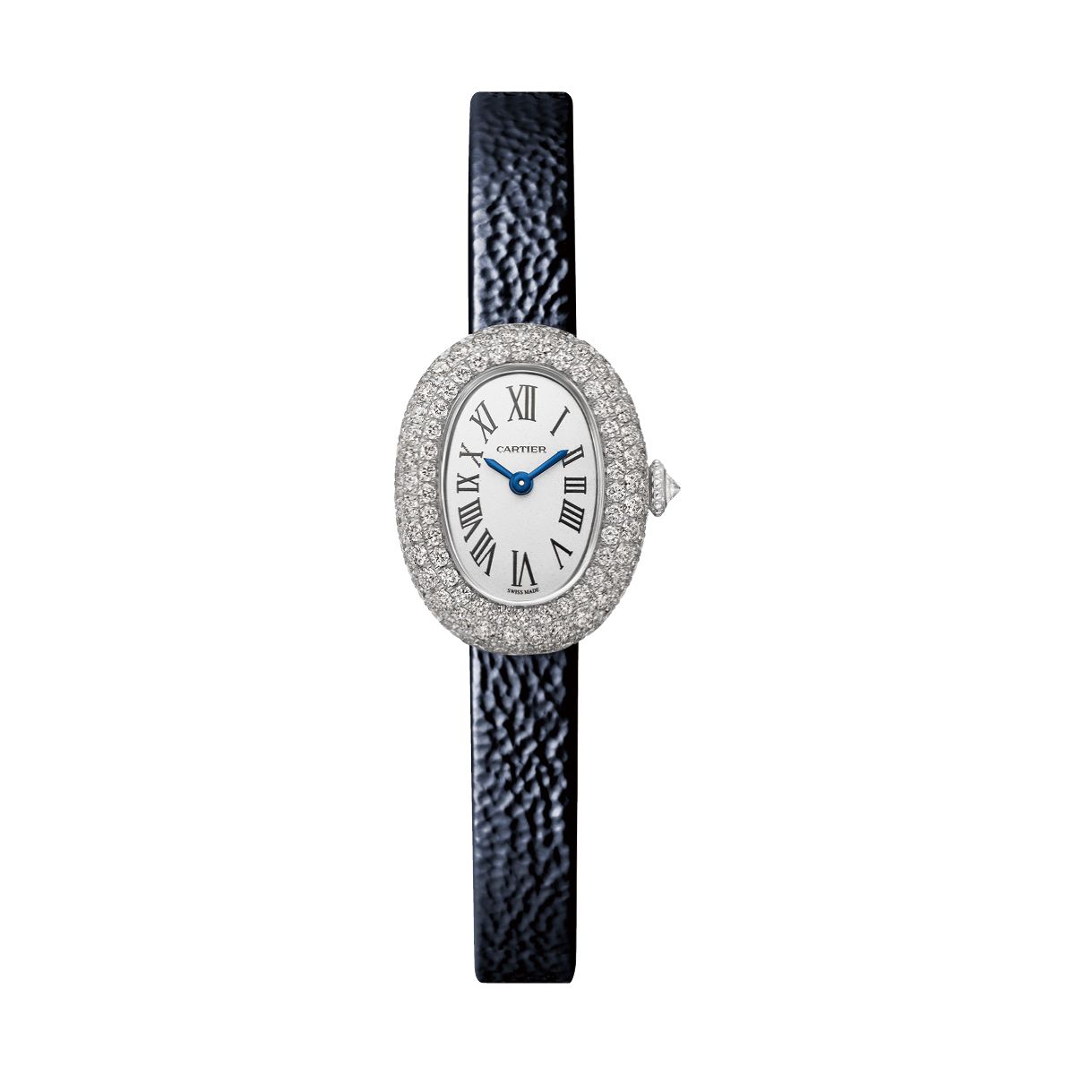 다이아몬드 세팅 베젤과 클래식한 네이비 스트랩이 조화를 이루는 베누아 워치는 가격 미정, Cartier.