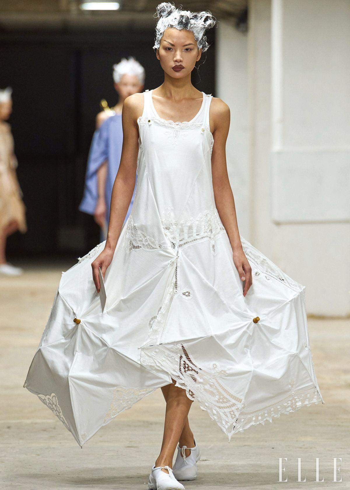 한편 실험적인 볼륨 패션을 보인 곳도 많았다. 우산을 활용한 두 브랜드, 바로 준야 와타나베와 호다코바. 준야 와타나베는 아일렛 디테일의 화이트 코튼 드레스를 만들었는데, 우산을 페티코트처럼 활용해 스커트를 구조적인 모습으로 구현했다.