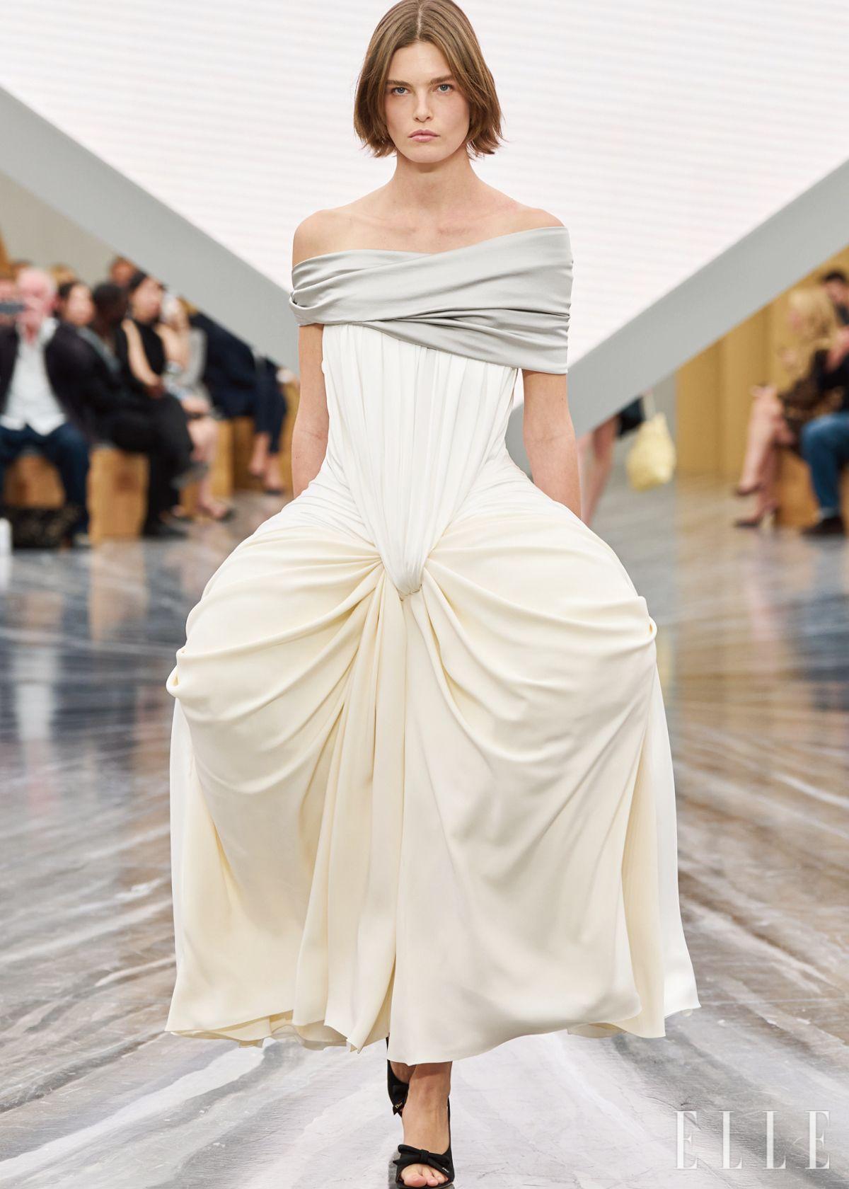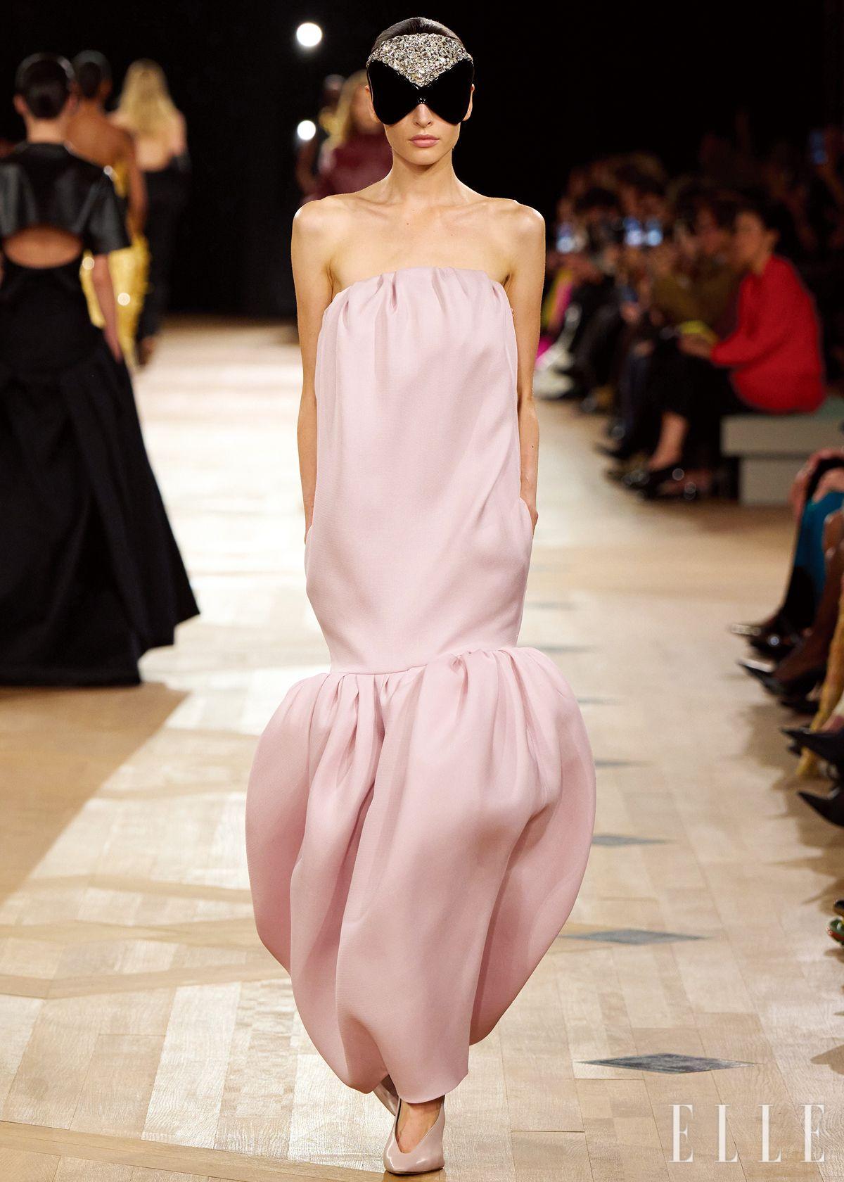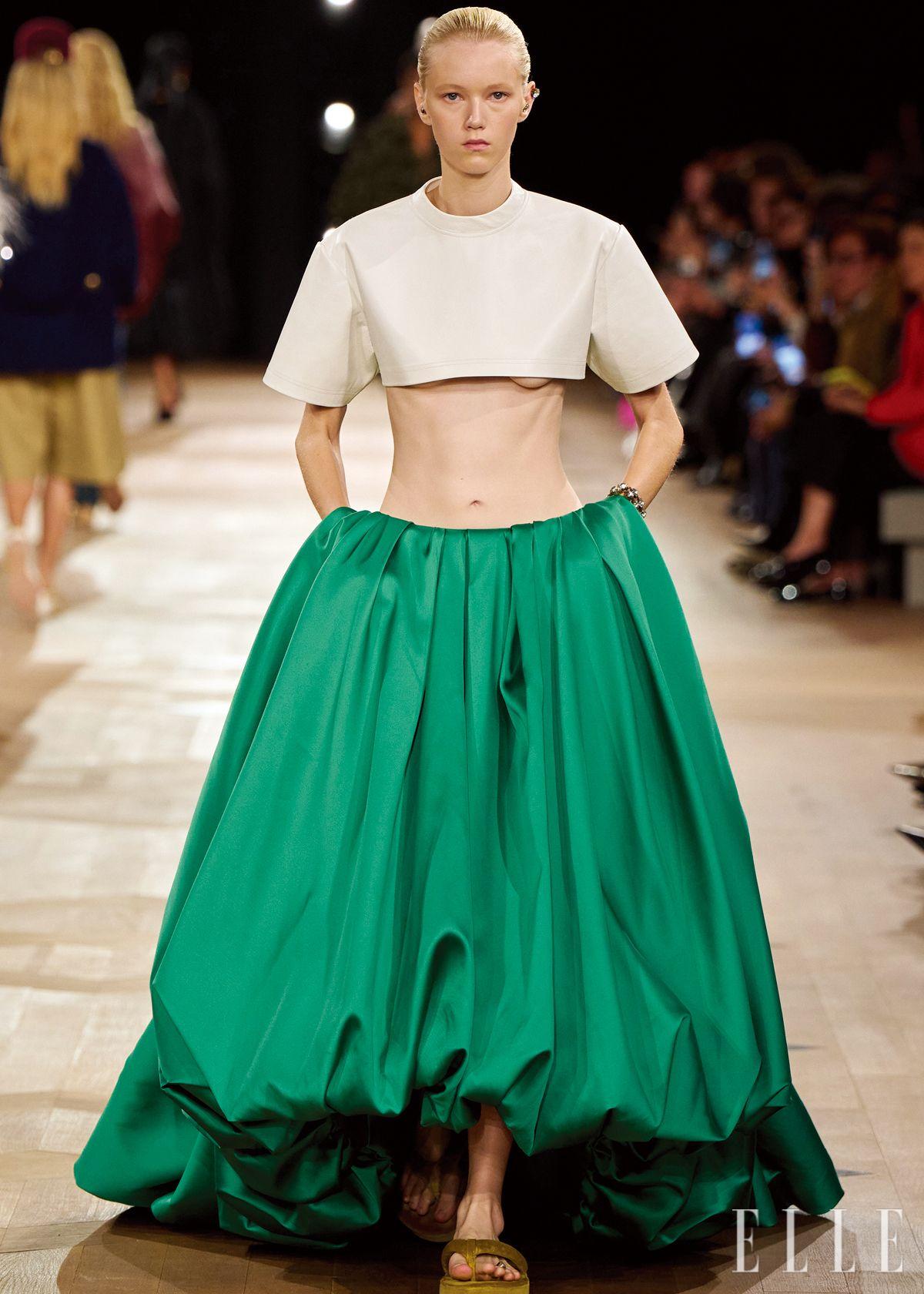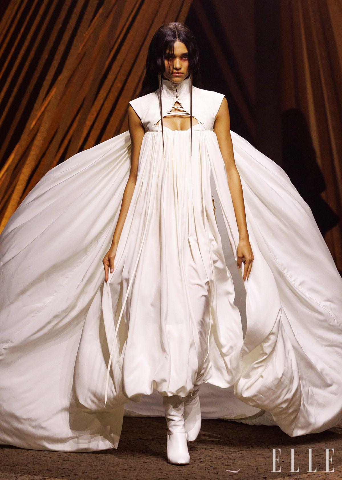 발렌시아가와 알라이아는 상체를 절제하는 대신 하체에 과감한 볼륨을 실어 실루엣의 무게중심을 낮췄다. 이때 스커트의 퍼지는 지점을 로 라이즈로 제작해 디자인을 모던하게 마무리한 것도 눈여겨볼 포인트. 이와 반대로 상체에 볼륨을 더한 건 자크뮈스. 얇은 화이트 롱 드레스를 제작했는데 상의 면적을 키워 케이프 같은 모습으로 만들었다. 런웨이에 등장한 모델이 팔을 구부려 실루엣을 키웠고 드레스는 우아한 자태의 실루엣으로 펼쳐졌다.