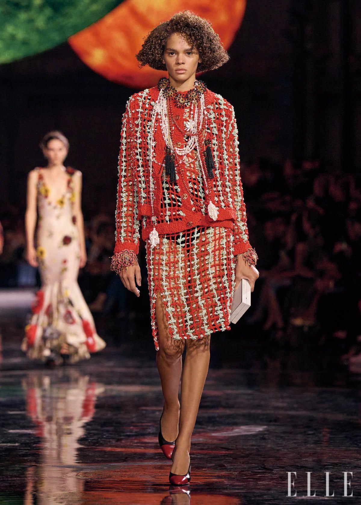 마티유 블라지는 실제 트위드를 사용하는 대신, 트위드 조직을 크게 확대해 촬영한 이미지를 실크 위에 프린트하거나 그 이미지와 똑같이 느슨하고 성글게 짠 니트를 사용해 새로운 트위드를 만들어내는 등의 방식으로 전환을 꾀했다. 까멜리아도 달라졌다. 둥글고 매끈하던 꽃은 울퉁불퉁한 진주 비즈를 엮은 입체적 형태로 바뀌었다. 완벽한 모양의 장식 대신, 손의 감각이 느껴지는 변주를 택한 것이다.