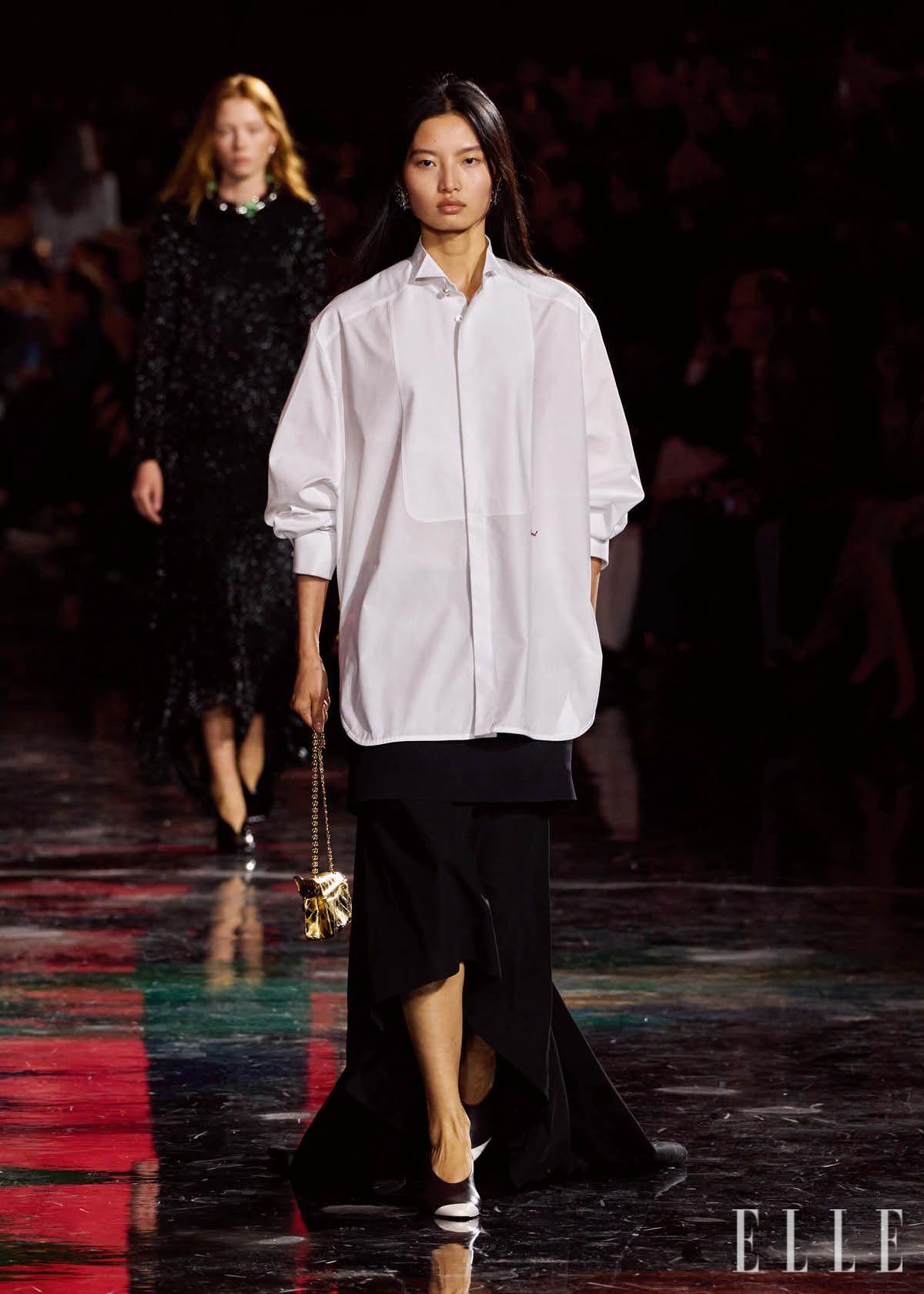 가장 인상적인 장면은 가장 조용한 룩에서 나왔다. 블랙 롱 스커트 위에 입은 화이트 셔츠 한 장. 별다른 디테일도 없이 간결하지만 눈길을 끄는 화이트 셔츠, 그 위에 필기체로 작게 수놓은 샤넬 로고를 살며시 더했다. 샤넬을 향한 마티유 블라지의 찬사는 눈에 보이지 않는 곳에서 드러난다. 이 셔츠 안쪽 끝에 트위드 재킷에 사용하던 묵직한 체인을 연결한 것. 옷자락이 펄럭이지 않도록 달던 샤넬만의 기능적 디테일, 그는 그 작은 디테일을 셔츠 안으로 옮겨왔다.