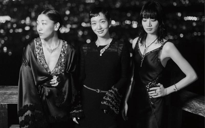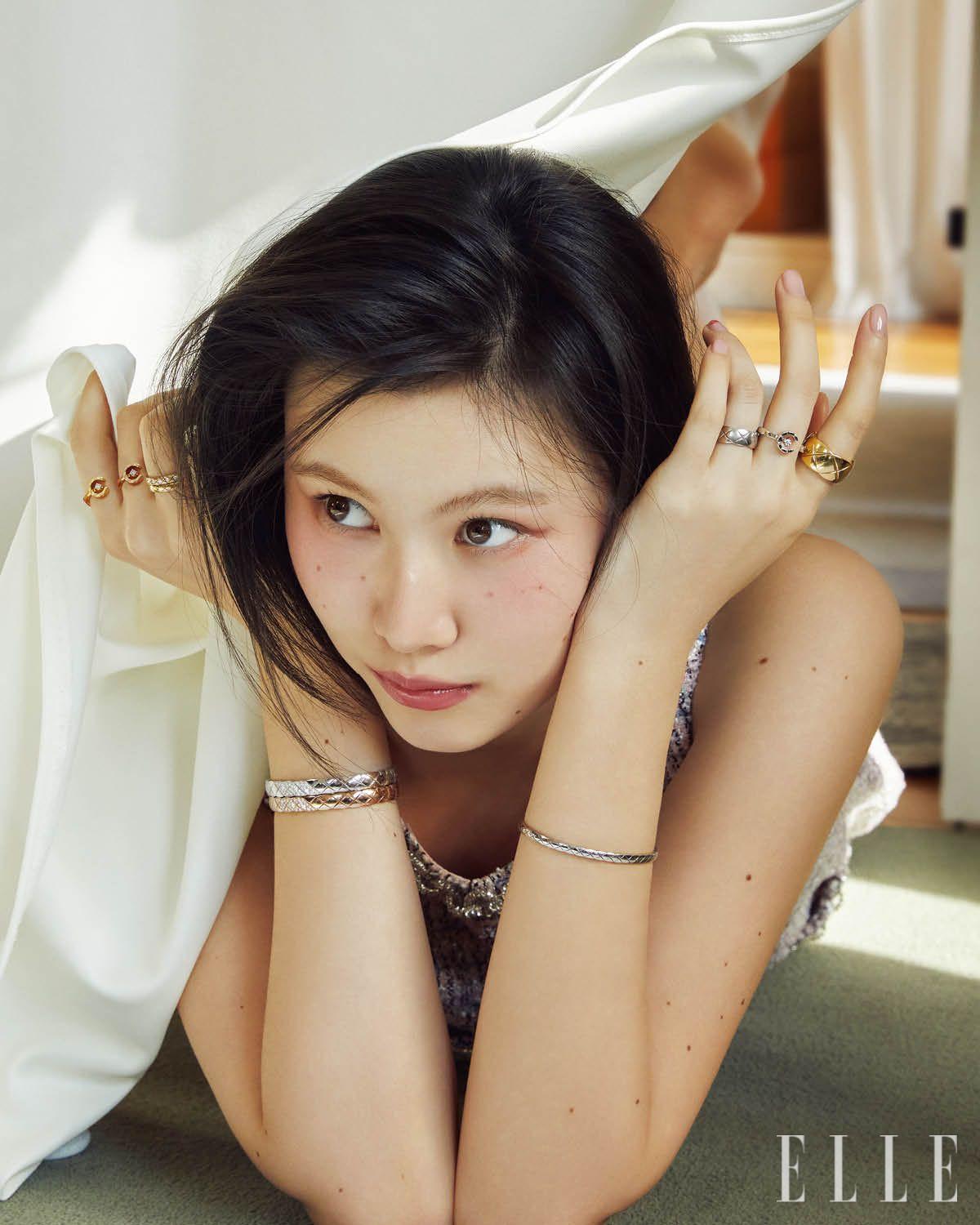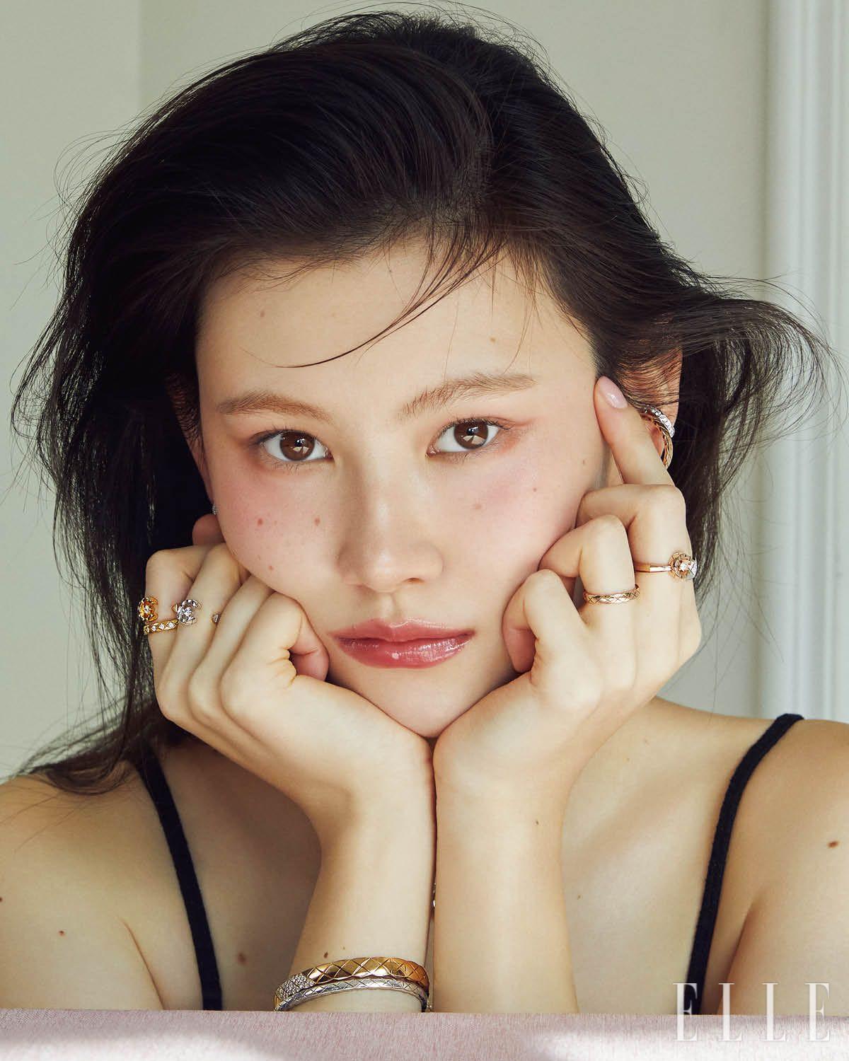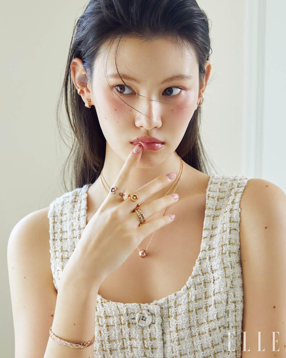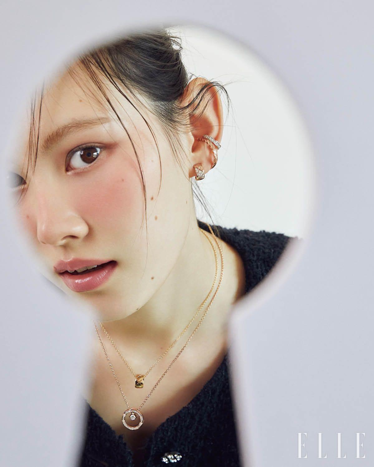오른쪽 귀에 착용한 18K 베이지골드 코코 크러쉬 싱글 이어링과 18K 베이지골드 코코 크러쉬 이어링, 오른손 검지에 낀 18K 베이지골드 코코 크러쉬 링, 중지에 낀 18K 옐로골드 코코 크러쉬 링, 소지에 낀 18K 화이트골드 코코 크러쉬 스몰 링, 18K 화이트골드 코코 크러쉬 미니 브레이슬릿, 18K 베이지골드 코코 크러쉬 브레이슬릿, 왼쪽 귀에 착용한 18K 베이지골드와 화이트골드 코코 크러쉬 싱글 이어링, 왼손 검지에 낀 18K 화이트골드 코코 크러쉬 링, 중지에 낀 18K 베이지골드 코코 크러쉬 미니 링, 18K 화이트골드 코코 크러쉬 스몰 링, 18K 화이트골드 코코 크러쉬 브레이슬릿은 모두 Chanel Fine Jewelry.