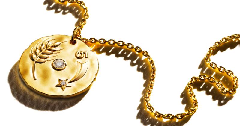 레이어드 효과를 낸 코코 크러쉬 싱글 이어링과 다이아몬드 세팅의 18K 베이지골드 코코 크러쉬 이어링, 18K 옐로골드 코코 크러쉬 네크리스, 다이아몬드 세팅 18K 베이지골드 코코 크러쉬 네크리스는 모두 Chanel Fine Jewelry.