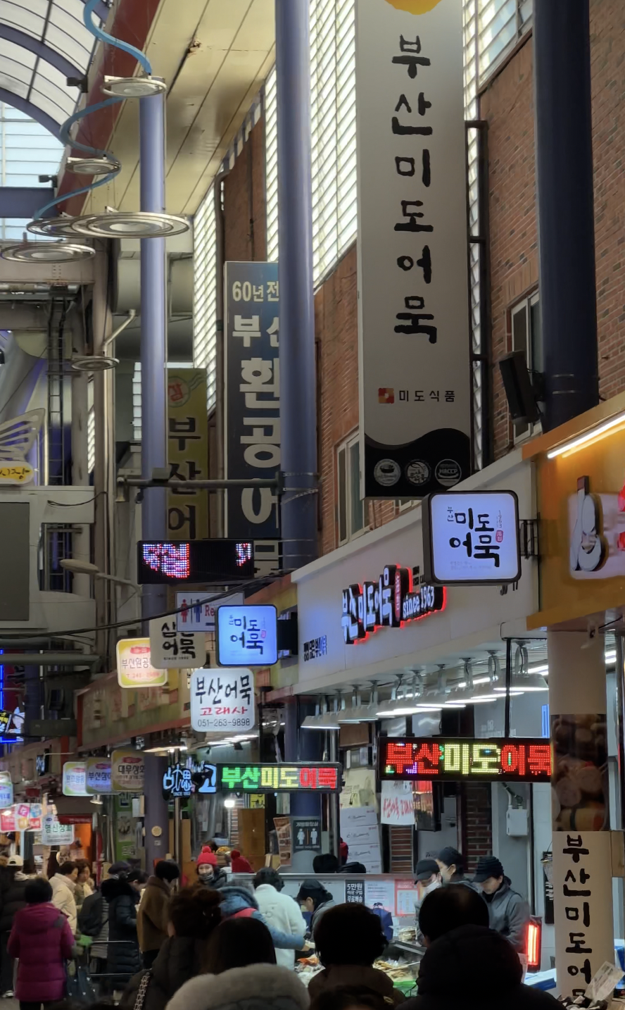 앞선 두 곳이 으리으리하게 지어진 신식 어묵 식당이었다면, 이번에는 로컬 느낌을 제대로 느낄 수 있는 곳입니다. 1963년부터 부평깡통시장에 자리잡아 현재까지 그 자리를 지키며 일대를 주름잡는 미도어묵입니다. 부산의 부평깡통시장에는 아예 어묵 골목이 따로 있을 정도로 다양한 어묵집들이 밀집해있는데요. 가장 줄이 긴 곳이 바로 이 미도어묵이었어요. 어묵은 보통 튀겨서 그 형태를 만들지만, 이곳은 튀긴 어묵, 구운 어묵, 찐 어묵 등 다양한 방법으로 어묵을 만들어 식감을 집중적으로 연구했습니다. 당일 만든 어묵이 산더미처럼 쌓여있는 모습은 보기만 해도 군침이 돌게 만드는 진풍경이죠. 이곳을 지나가면 이모님들이 직접 갓 나온 어묵을 잘라서 시식을 권하시는데요. 시장 한 가운데서 집어먹는 조각 어묵의 맛이 그렇게 별미라서 꼭 양손 가득 폭풍 어묵 쇼핑을 하게 된답니다. 사실 미도어묵 말고도 정말 많은 어묵 가게가 시식코너를 운영하며 유혹하지만, 결국 다시 이곳으로 돌아와 어묵을 잔뜩 사게 될 거예요. 한 손에는 갓 튀긴 핫바까지 들고서요.