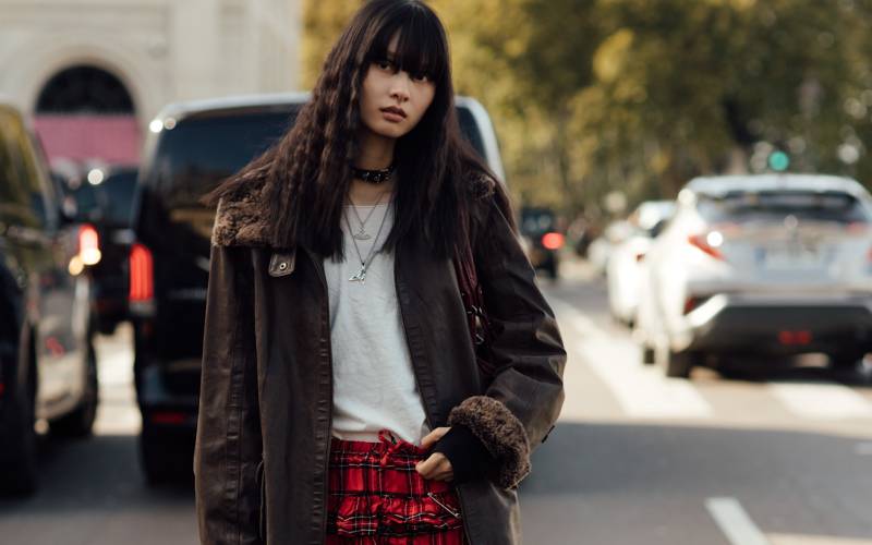 더 이상 치마 새깅 룩은 미니스커트의 것만이 아님을 보여주는 사례입니다. 전통적인 킬트 무드의 스커트가 새깅과 결합해 클래식한 멋이 돋보이는 스타일링이죠. 빈티지한 가죽 자켓과 롱부츠를 매치해 소재가 주는 무게감을 강조한 덕분에, 골반을 낮게 잡은 하의 실루엣이 오히려 스타일리시한 포인트로 작용합니다.