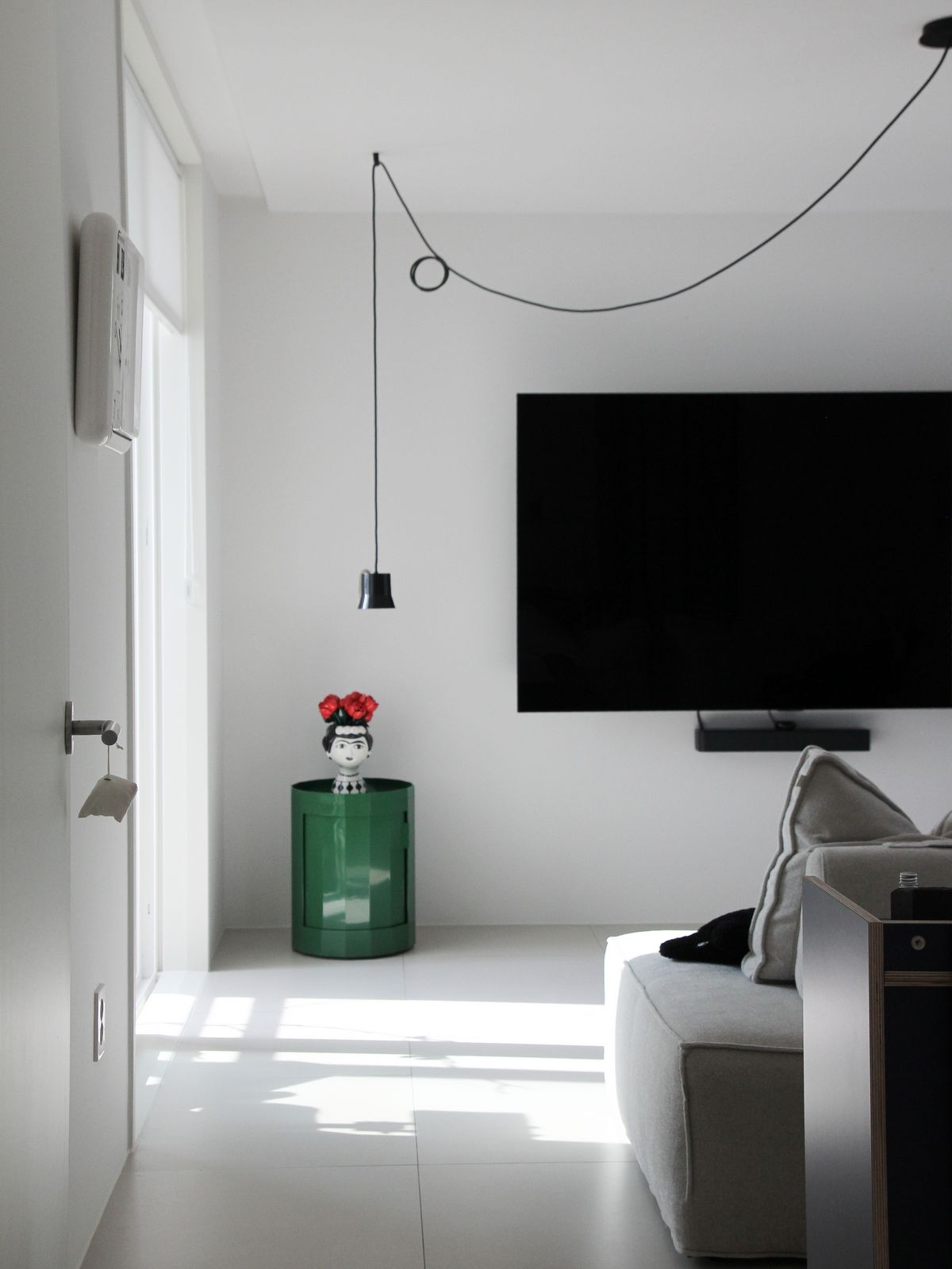 구축 아파트의 안방은 TV룸으로 사용하고 있어요. 이 공간의 중심은 길게 늘어진 아르떼미데의 Gio 펜던트 조명입니다. 방구석 영화관 같은 분위기를 원해 밝지만 확실한 포인트가 되는 조명을 선택했어요. 설치 사례는 많지 않지만, 제가 무척 좋아하는 조명이라 언젠가 집을 다시 짓게 된다면 또 들이고 싶어요.