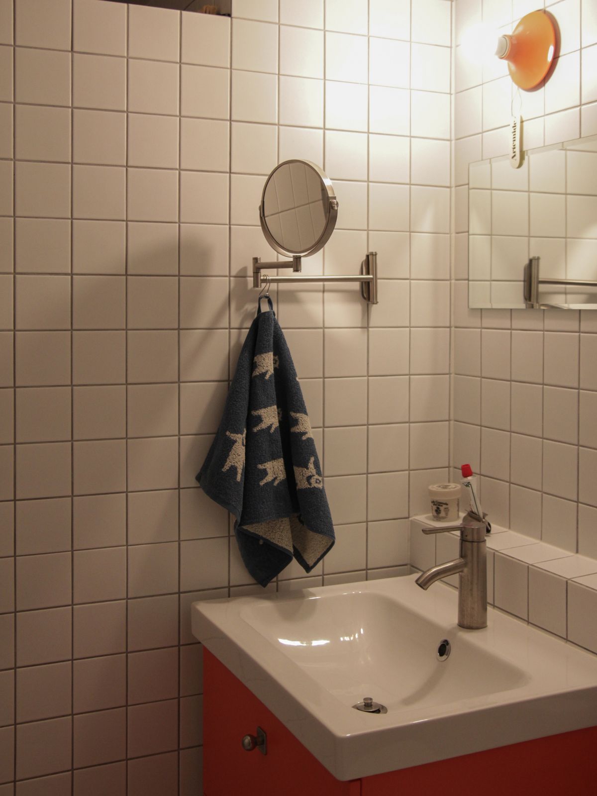 두 개의 화장실은 공사 기간을 줄이기 위해 100각 무광 화이트 타일에 비둘기색 메지를 사용했습니다. 샤워부스 대신 조적벽을 선택했고, 벽에 달린 수납장은 두지 않았어요. 작은 선반에 액자를 올리고, 60×30 사이즈의 작은 거울을 맞춰 붙였습니다. 정답처럼 꾸며진 욕실보다는 제가 상상했던 모습에 가깝게 담아내고 싶었어요. 다음에는 또 다른 컬러의 100각 타일로 욕실을 시도해보고 싶습니다.