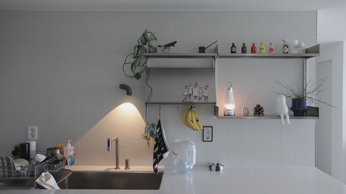 여기에 레어로우의 스테인리스 선반으로 포인트를 더했어요. 머릿속으로 여러 번 시뮬레이션하며 계산해 만든 공간인데, 지금까지 집 안에서 가장 잘한 선택 중 하나라고 생각합니다.