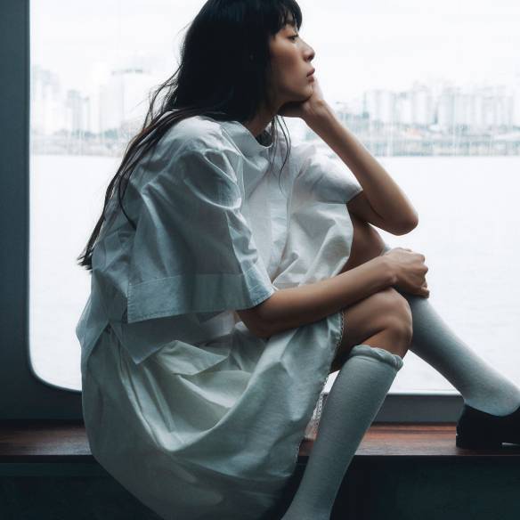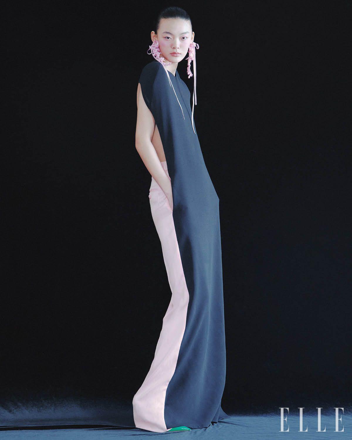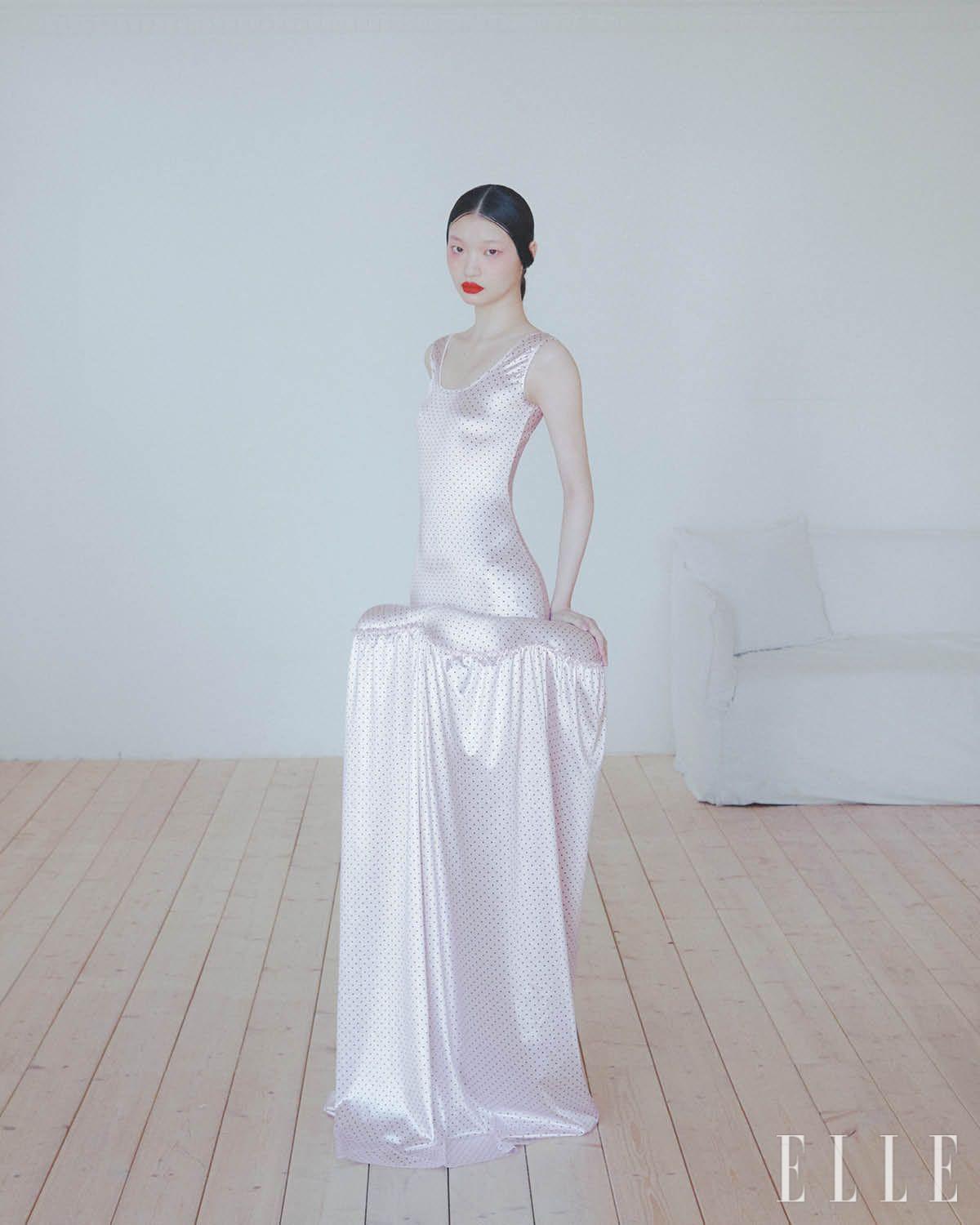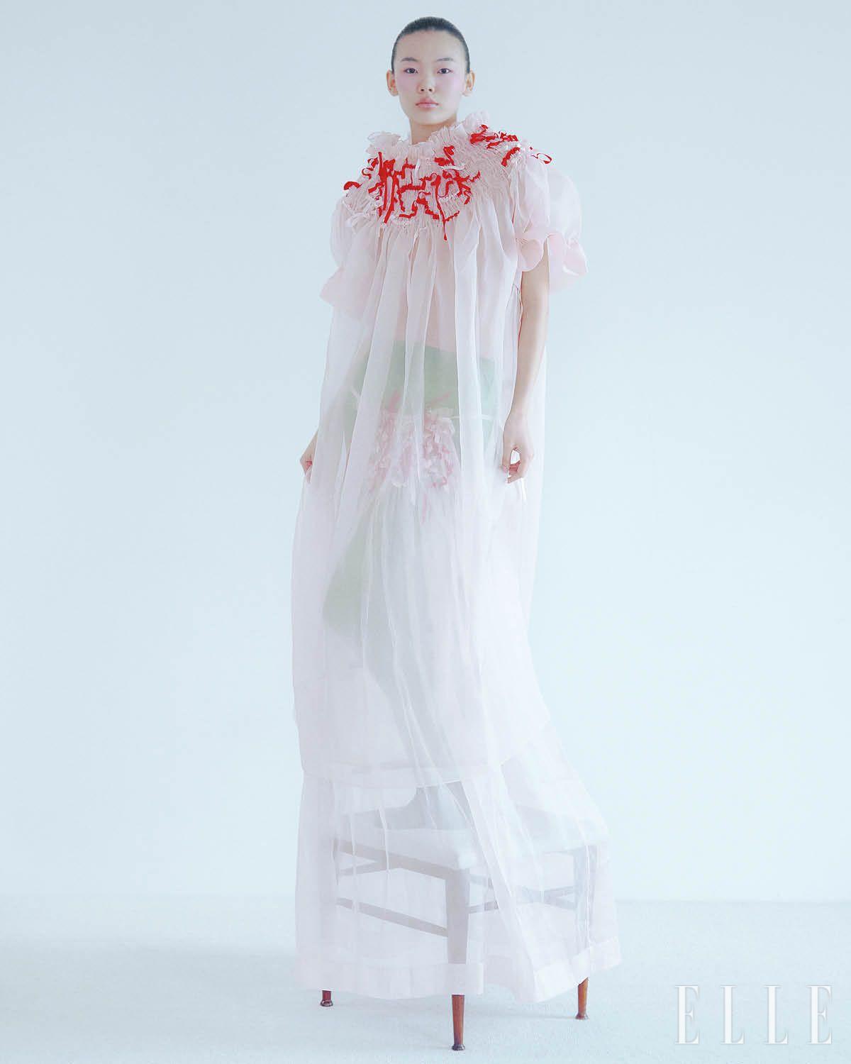 리본 디테일의 시스루 원피스와 겹쳐 입은 드레스는 모두 가격 미정, R.l.e.