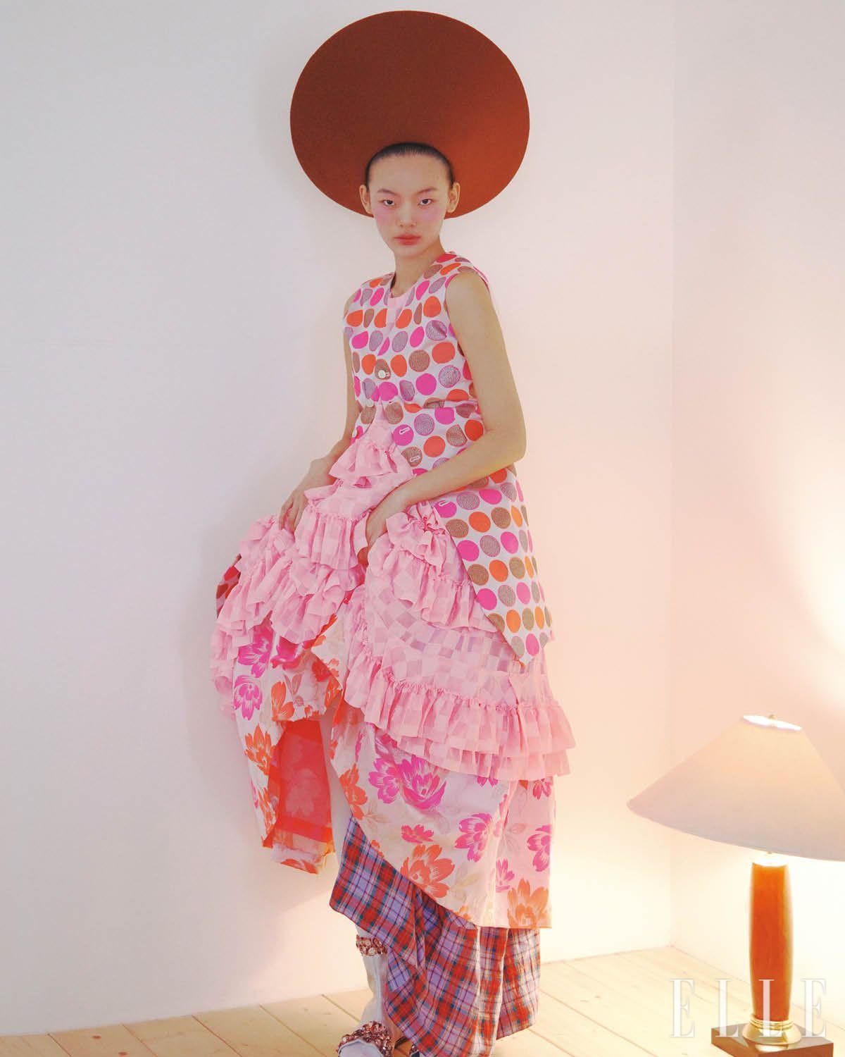 도트 패턴의 베스트와 러플 드레스, 플라워 패턴의 스커트는 가격 미정, 모두 Comme Des Garçons. 레이어드한 체크 스커트는 1백78만원, Vivienne Westwood. 펠트 햇은 가격 미정, Loro Piana. 실버 앵클부츠는 가격 미정, Louis Vuitton.