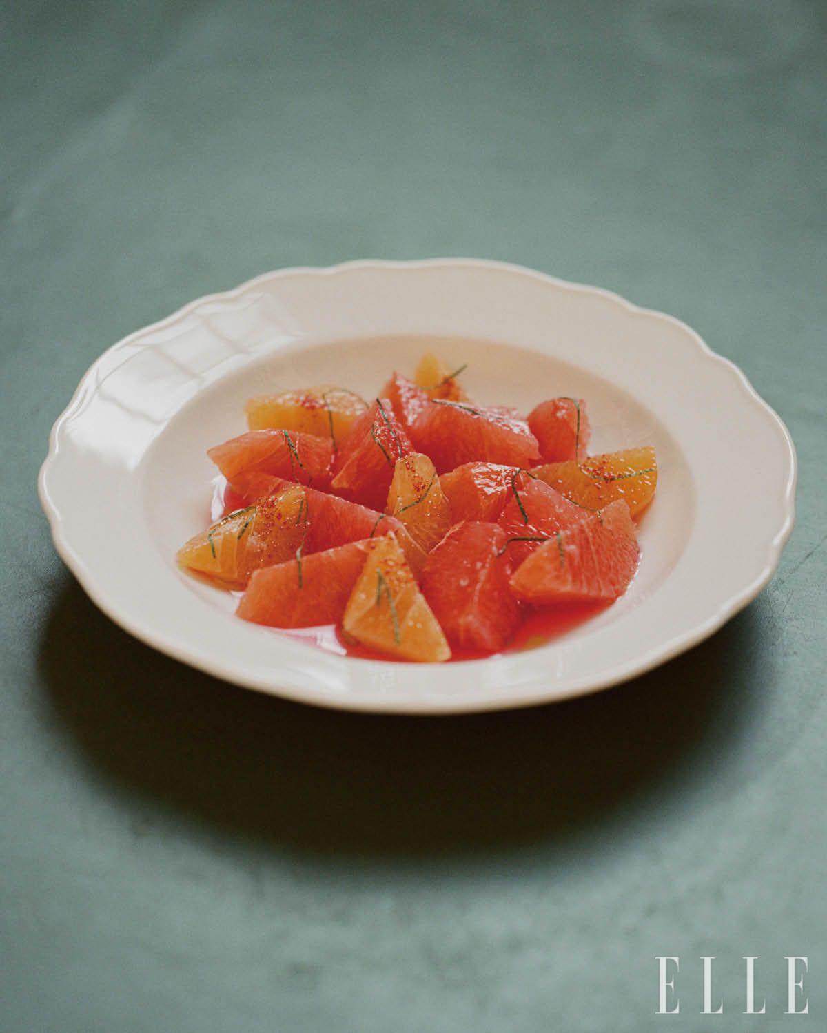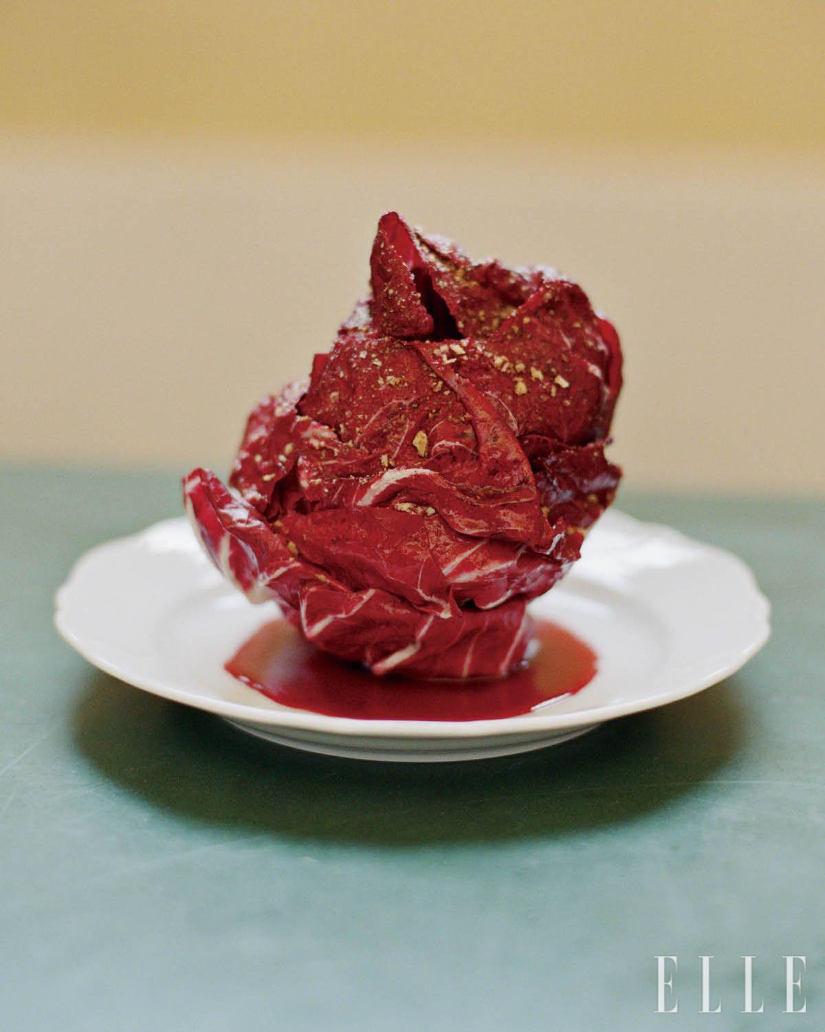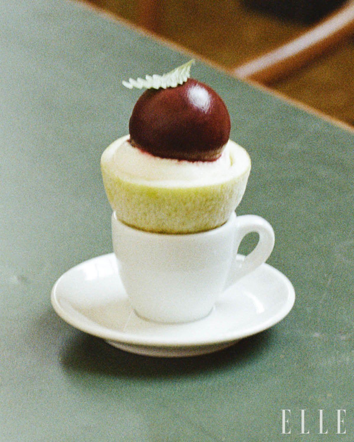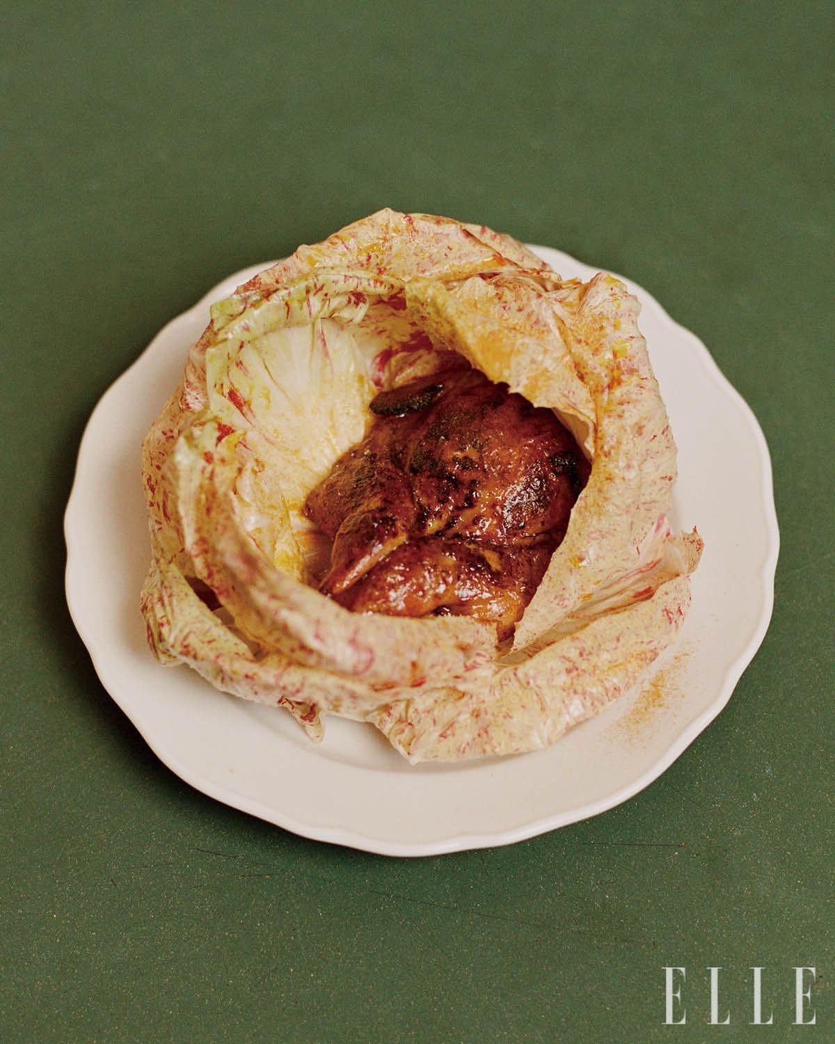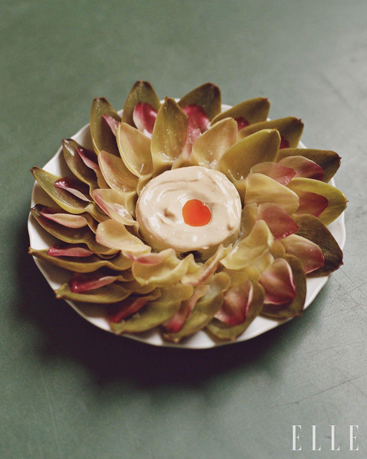 ‘시즈닝과 감각적 경험(Sensory Experience)’을 모든 요리의 기본 원칙으로 삼아요. 한 문화의 핵심 재료를 다른 문화의 맥락에 놓는 것도 중시하죠. 일본과 이탈리아에서 영감을 받은 살라다 로소(Salada Rosso)가 대표적 예입니다. 적색 치커리를 하나하나 분리한 뒤 다시 조립하고, 그 안에 아몬드와 블랙 갈릭 크림을 채워 넣는 요리예요. 발사믹 식초와 간장, 꿀, 미림, 히비스커스로 우린 쌀 식초 등을 드레싱으로 사용해 쓴맛을 산미와 감칠맛으로 끌어올리는 것이 핵심이죠.