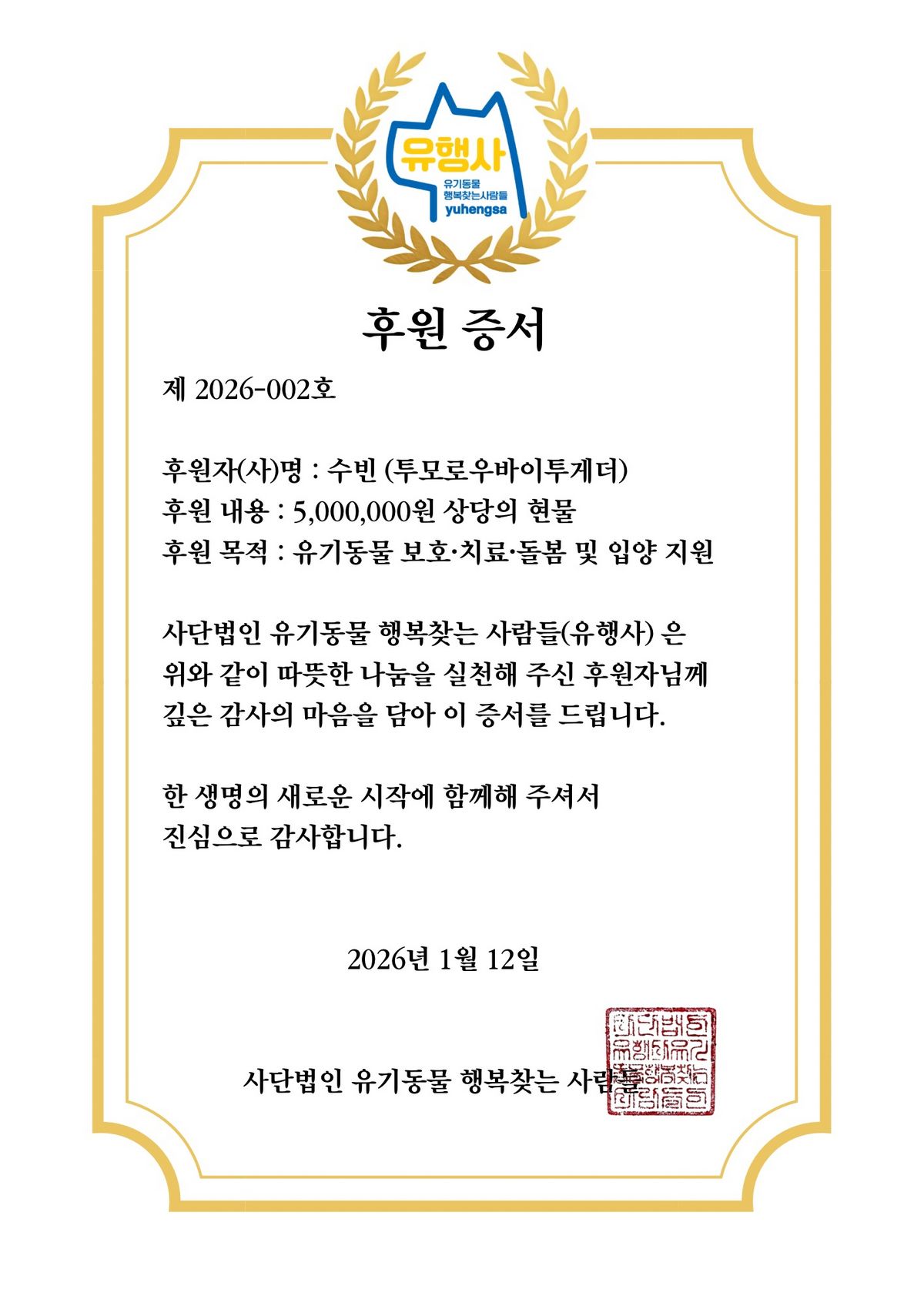 」수빈은 반려견과 함께 만드는 새로운 움직임을 표방하는 브랜드 멀로(MERLOT)와 함께 500만 원 상당의 도그 웨어는 물론, <엘르>와 함께 현금 500만 원을 합산한 총 1000만 원의 상당의 후원금을 사단법인 유행사(유기동물 행복찾는 사람들 @yuhengsa)에 기부했습니다. 유행사는 오직 후원금으로 운영되는 비영리 공익법인으로, 안락사 직전의 유기동물들을 구조해 치료와 훈련을 거쳐 입양까지 연결합니다. 이날 국가를 위해 헌신하고 입양을 기다리는 마약탐지견 난초와 브라보, 태일과 함께 마음을 나눈 수빈은 청춘을 희생한 이들에게도, 유행사의 유기견들에게도 끝까지 책임질 수 있는 가족이 나타나길 간절히 바랐습니다.