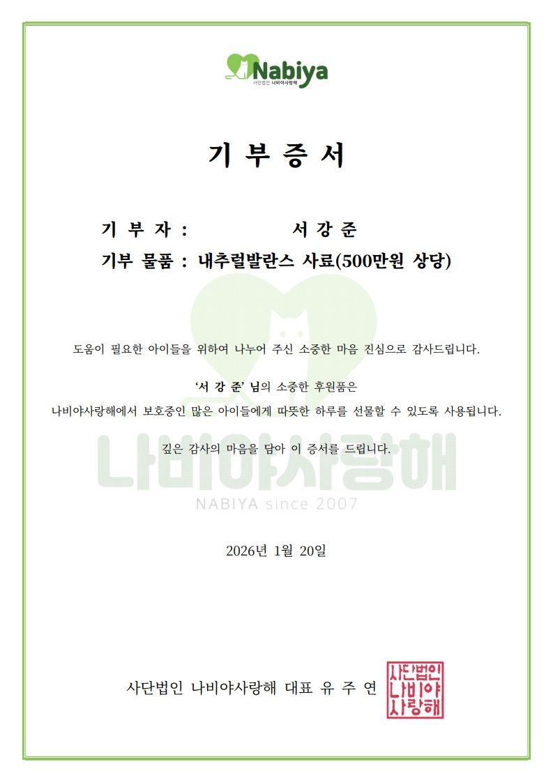 」배우 서강준은 프리미엄 펫푸드 브랜드 내추럴발란스(Natural Balance)의 500만 원 상당 사료와 <엘르>의 후원금 500만원을 사단법인 나비야사랑해(@nabiya.2007)에 기부했습니다. 이날 촬영에 함께했던, 난청을 앓는 고양이 쇼리를 보호 중인 이 단체는 200여 마리의 유기, 구조묘들의 치료와 입양을 이어가고 있습니다. 반려묘 도키, 키키, 오키와 함께 살아가고 있는 그는 유기묘들이 더는 아프지 않았으면 좋겠다고, 그저 즐겁게 살기를 바라는 것이 전부라고 말했습니다.