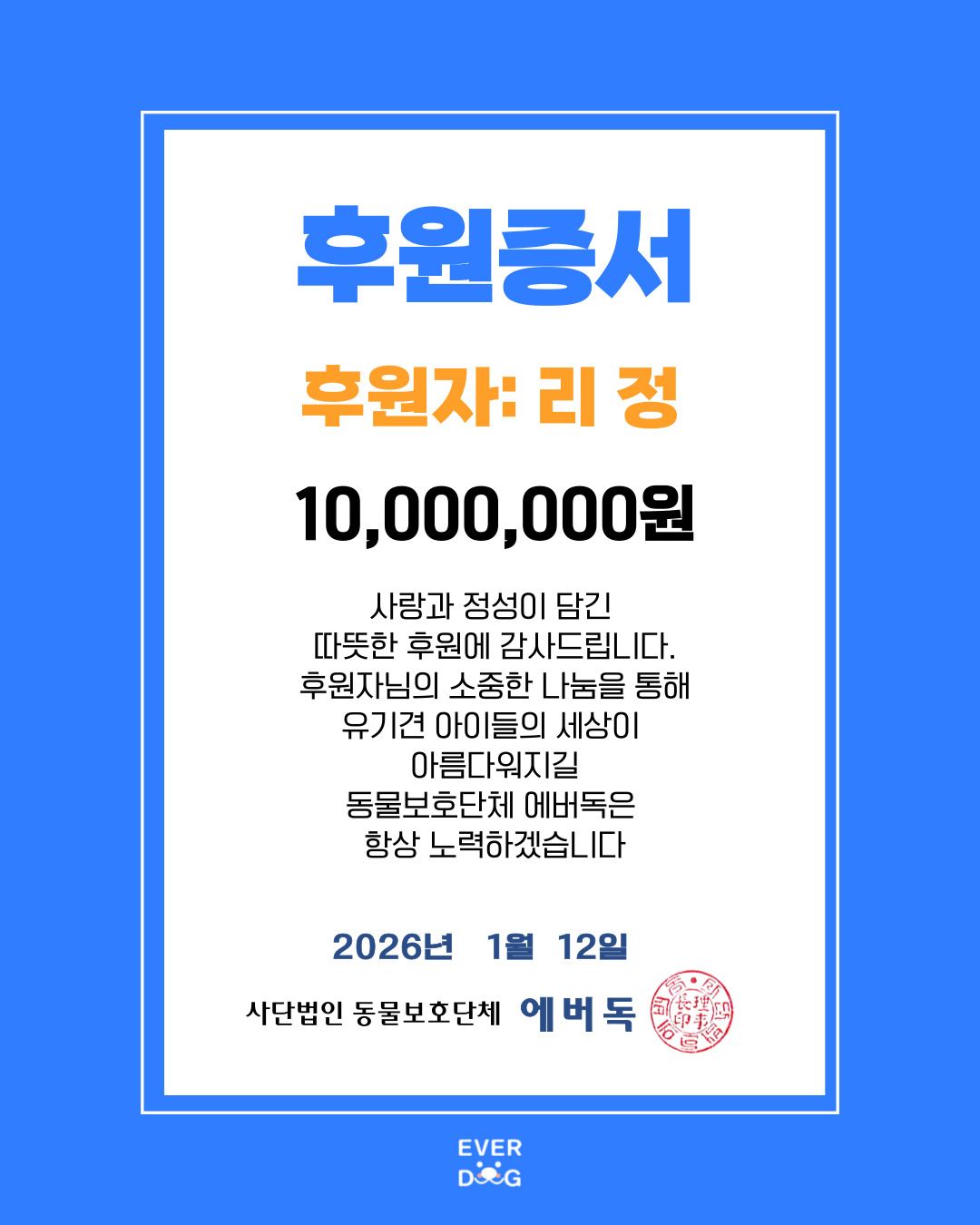 」리정은 민감성 피부로 고통받는 사람들의 더 나은 삶을 위해 노력하는 뷰티 브랜드 라로슈포제(LAROCHEPOSAY)와 뜻을 모아 모델료 1000만 원 전액을 사단법인 에버독에 기부했습니다. 전북 군산을 기반으로 활동하는 에버독(@gunsan_animalbaby)은 노견, 환견, 장애견 등 입양이 특히나 어려운 개들을 집중적으로 구조하고 보호하는 단체로, 유기견 쉼터 ‘개린이 쉼터’를 직접 운영하며, 생의 마지막 순간까지 책임지는 보호를 실천합니다. 며칠만 임시보호 할 생각으로 두두를 집으로 맞이했지만, 곧장 평생 가족이 될 운명이란 걸 알아차렸다는 리정과 두두의 예쁜 마음이 온 세상에 번져 에버독의 더 많은 유기견들 또한 운명의 가족을 찾을 수 있기를!