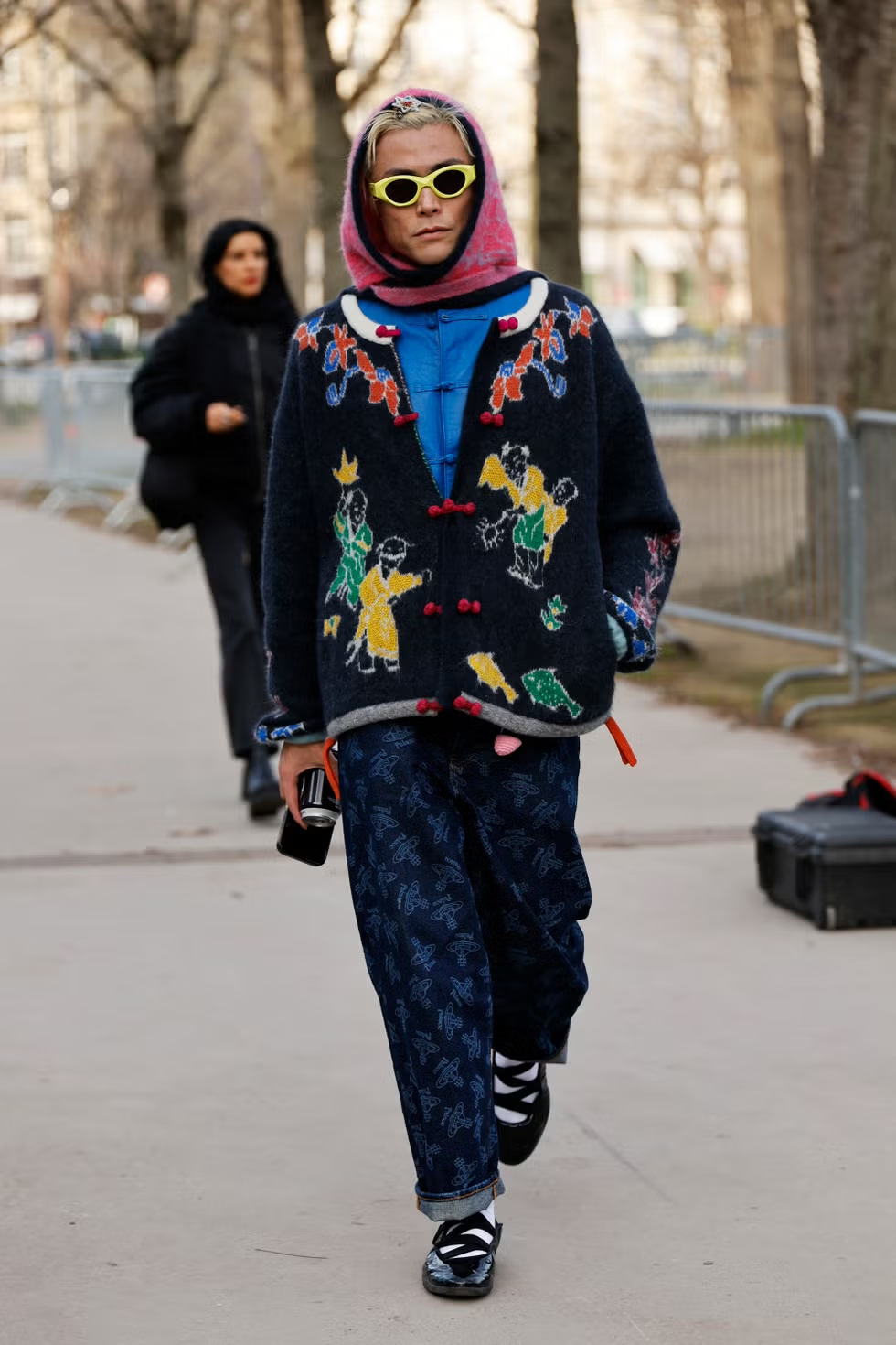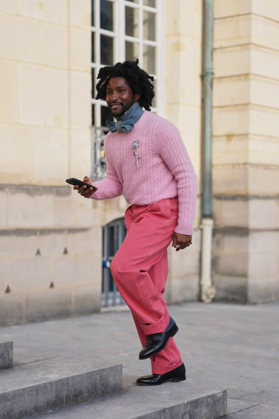 턴업 진은 이번 시즌, 다시 주류로 돌아왔습니다. 스트레이트 혹은 루스한 실루엣처럼 한층 더 자연스러운 모습으로 말이죠. 최근 남성 패션위크에서도 턴업 진은 반복적으로 포착됐습니다. 특히 눈에 띈 건 힘 있게 눌러 다린 듯 정돈된 밑단이었죠. 신발 위로 흐물거리며 떨어지는 대신, 발목에서 또렷하게 멈추는 길이감이 특징이었습니다. 디올 옴므 쇼장 밖에서는 라즈베리 핑크 톤의 턴업 진이 시선을 사로잡았습니다. 계산된 듯하면서도 즉흥적인 밑단은 스타일 전체에 생동감을 더해줬죠.