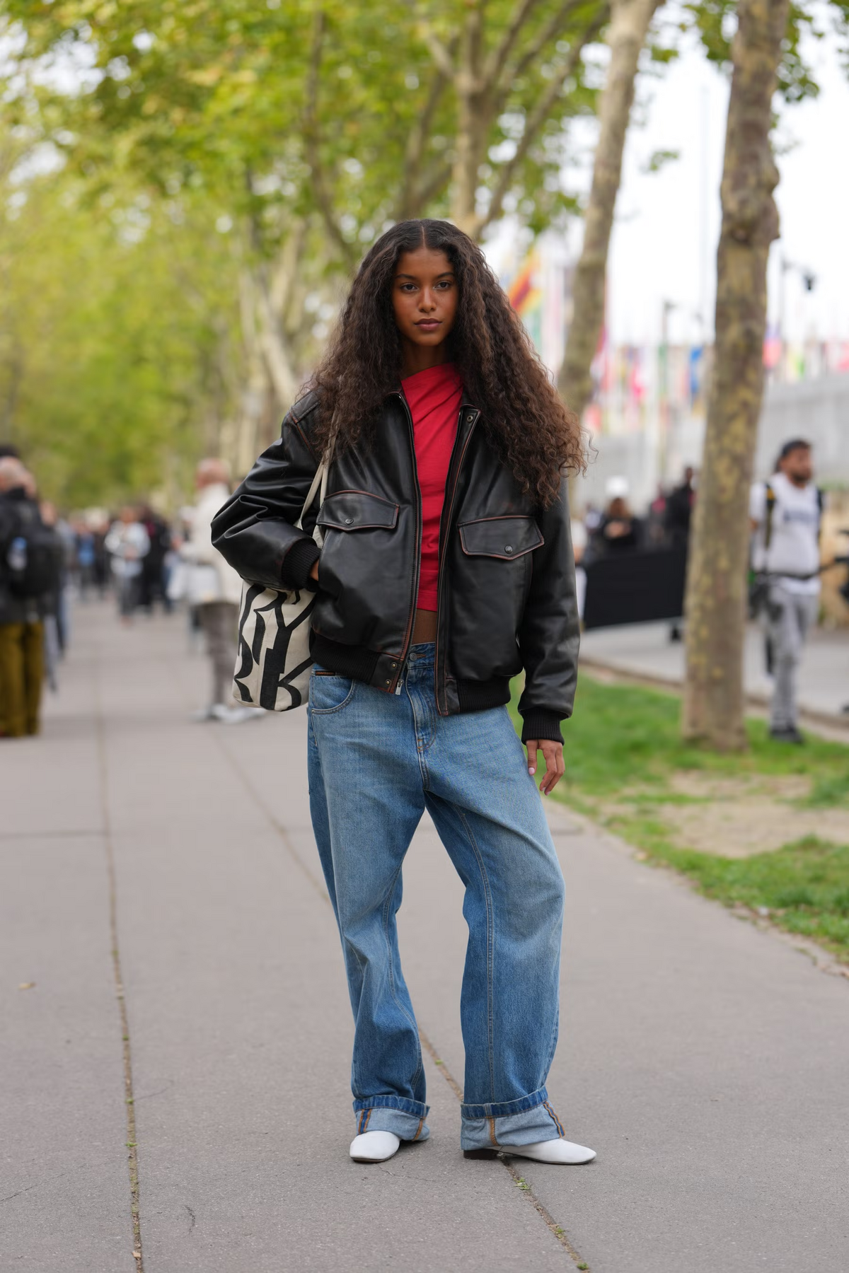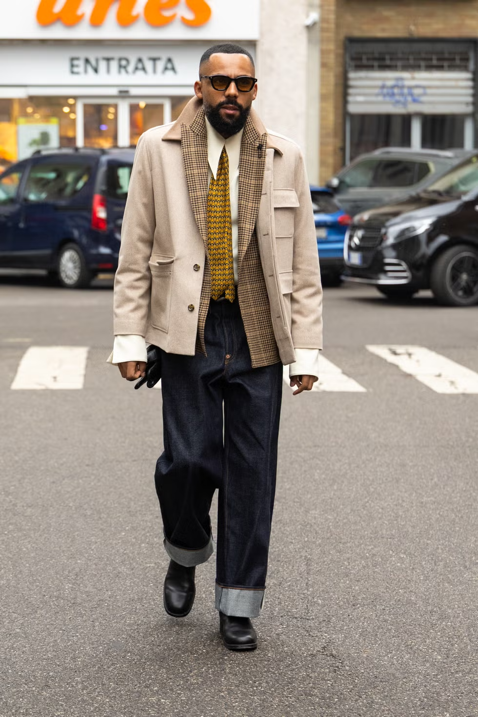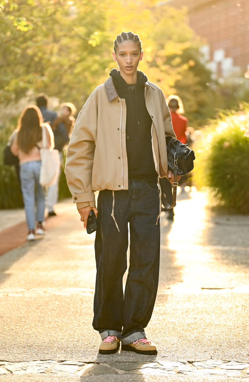 가장 쉬운 방법은 캐주얼한 재킷에 매치하는 쪽입니다. 워킹 부츠나 테크니컬 스니커즈 위로 밑단이 자연스럽게 걸리도록 길이를 선택하는 것이 핵심이죠. 발목을 훌쩍 지나 여유 있게 떨어지는 배기 핏 턴업 진은 완벽한 슬라우치를 연출합니다. 힘을 뺀 듯하지만 계산된 실루엣, 그 미묘한 균형이 관건입니다. 재킷은 지나치게 몸에 맞기보다 약간 여유 있는 핏을 택해 보세요. 밑단의 묵직함과 어깨선의 여유가 만나면서 자연스러운 스트리트 무드가 완성될 테니까요.