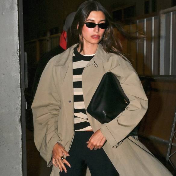 반면 가죽 코트는 또 다른 결을 보여줍니다. 마고 로비처럼 블랙 레더 트렌치를 선택하면 실루엣은 같아도 훨씬 단단한 인상이 남죠. 여기에 빅 백을 더한 방식은 군더더기 없이 정리된 스트리트 룩이 완성됩니다.