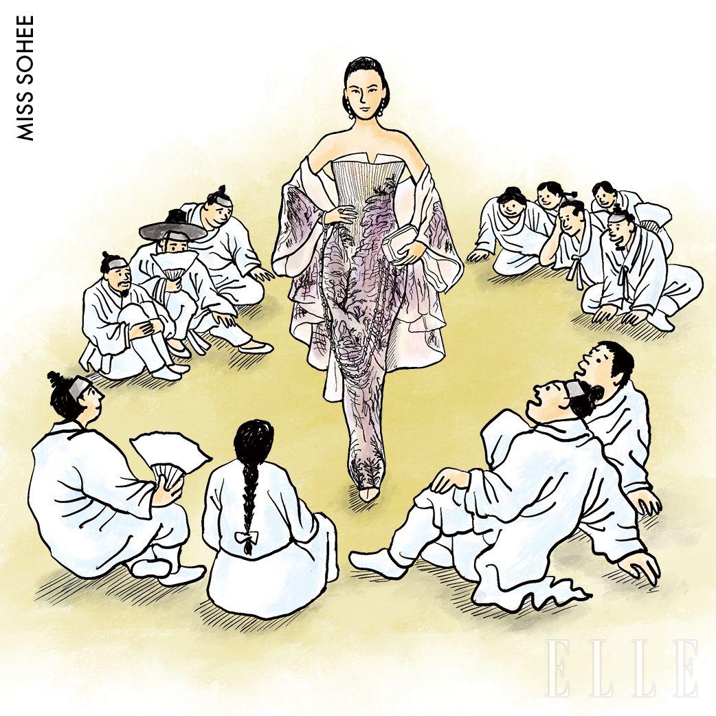 」미스 소희의 한국 사랑은 어디까지? 이번 컬렉션 역시 한국적 아름다움을 한층 더 입체적으로 수놓았다. 화려하면서도 고풍스러운 룩 사이로 익숙한 그림 하나가 시선을 사로잡았다. 바로 김홍도의 산수화. 드레스와 가운 위에 섬세하게 펼쳐진 풍경은 다시 한 번 애국심으로 불타오르게 만든다.