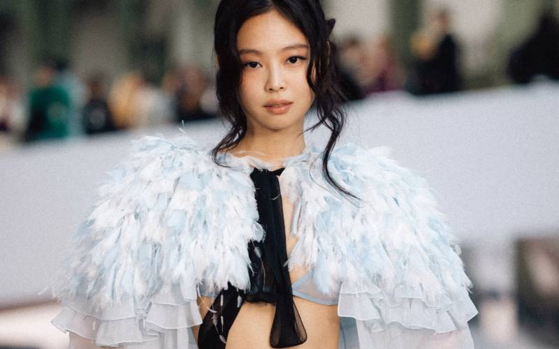 캐시미어와 실크로 만든 카울넥 니트 톱과 화이트 플라워 모티프의 벨벳 페플럼 실크 조젯 스커트, 수국 모양의 귀고리, 뱅글과 클러치백, 슈즈는 모두 Dior S/S 2026 Haute Couture Collection.