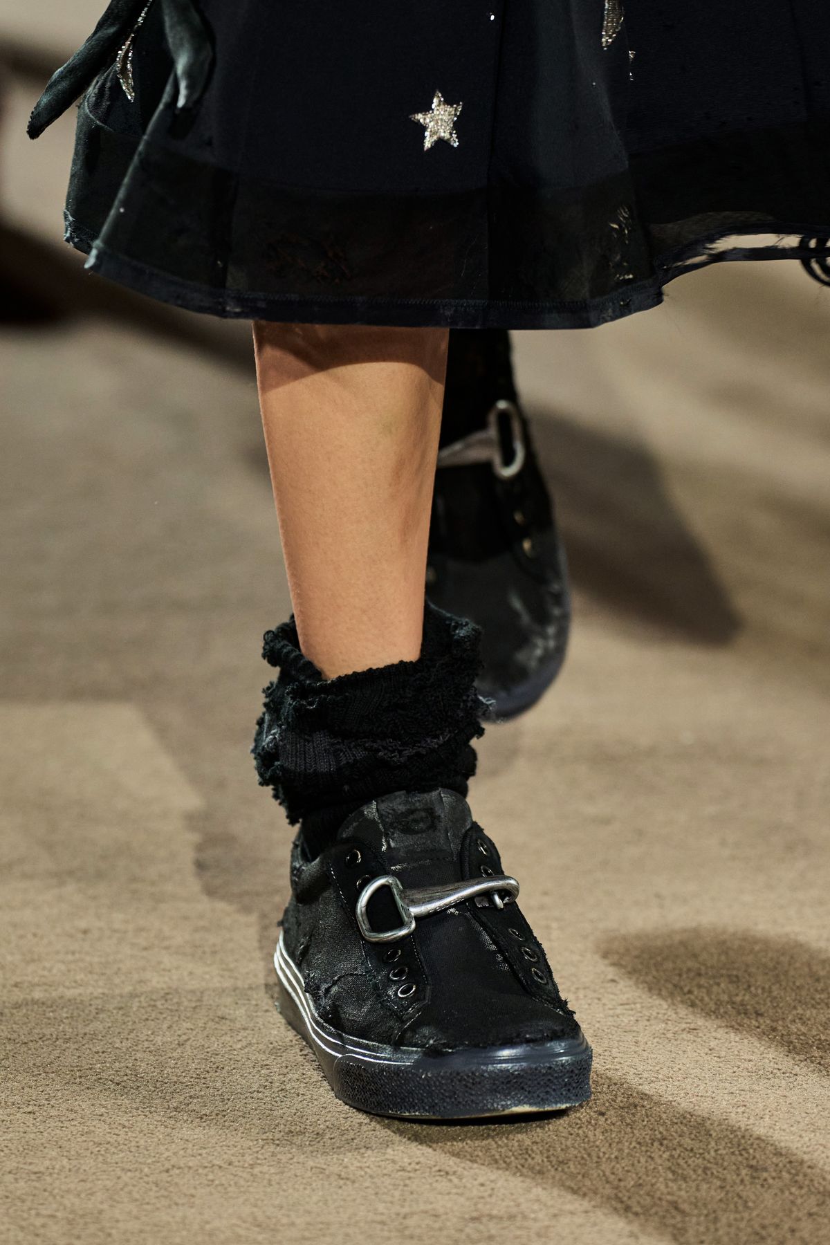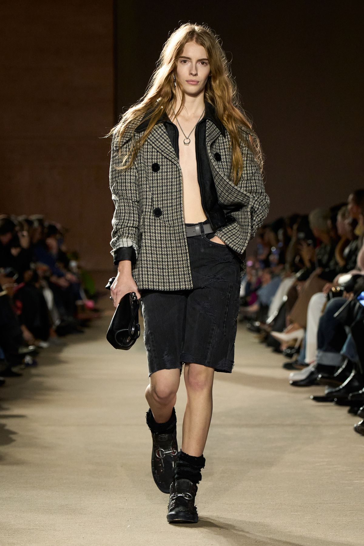 룩은 텍스처와 실루엣의 대비로 완성됐다. 가죽과 시어링 재킷, 울 테일러링, 리퍼포즈드 데님 팬츠가 믹스되며, 1940년대 테일러링과 1970년대 스포츠웨어가 교차한다. 플레어 팬츠, A라인 스커트, 안감을 드러낸 블레이저, 그리고 클래식한 롱드레스에 그래피티 같은 거친 터치를 입혔다. 특히, 30~40년대 할리우드풍 이브닝 가운은 커팅과 아플리케 장식으로 현대적인 글래머를 완성한다.