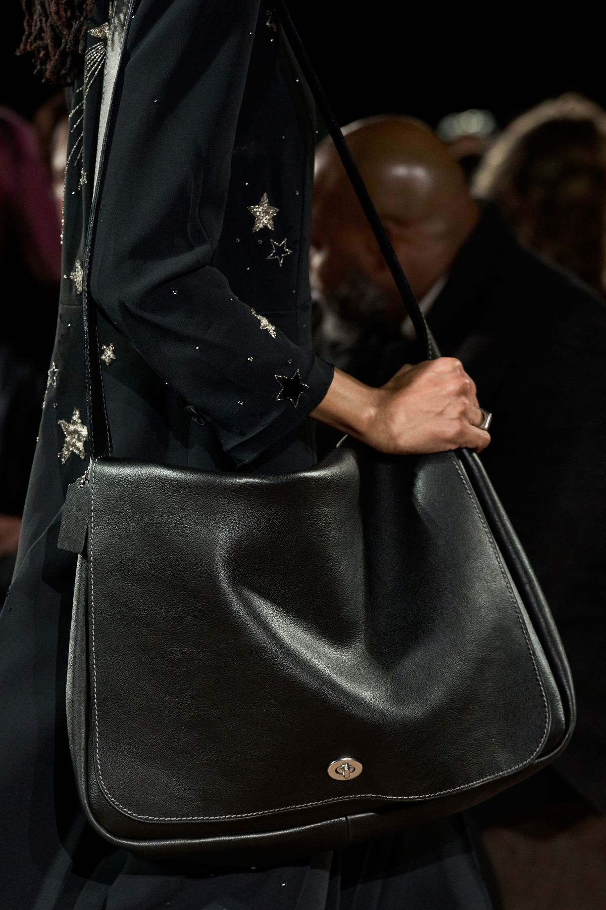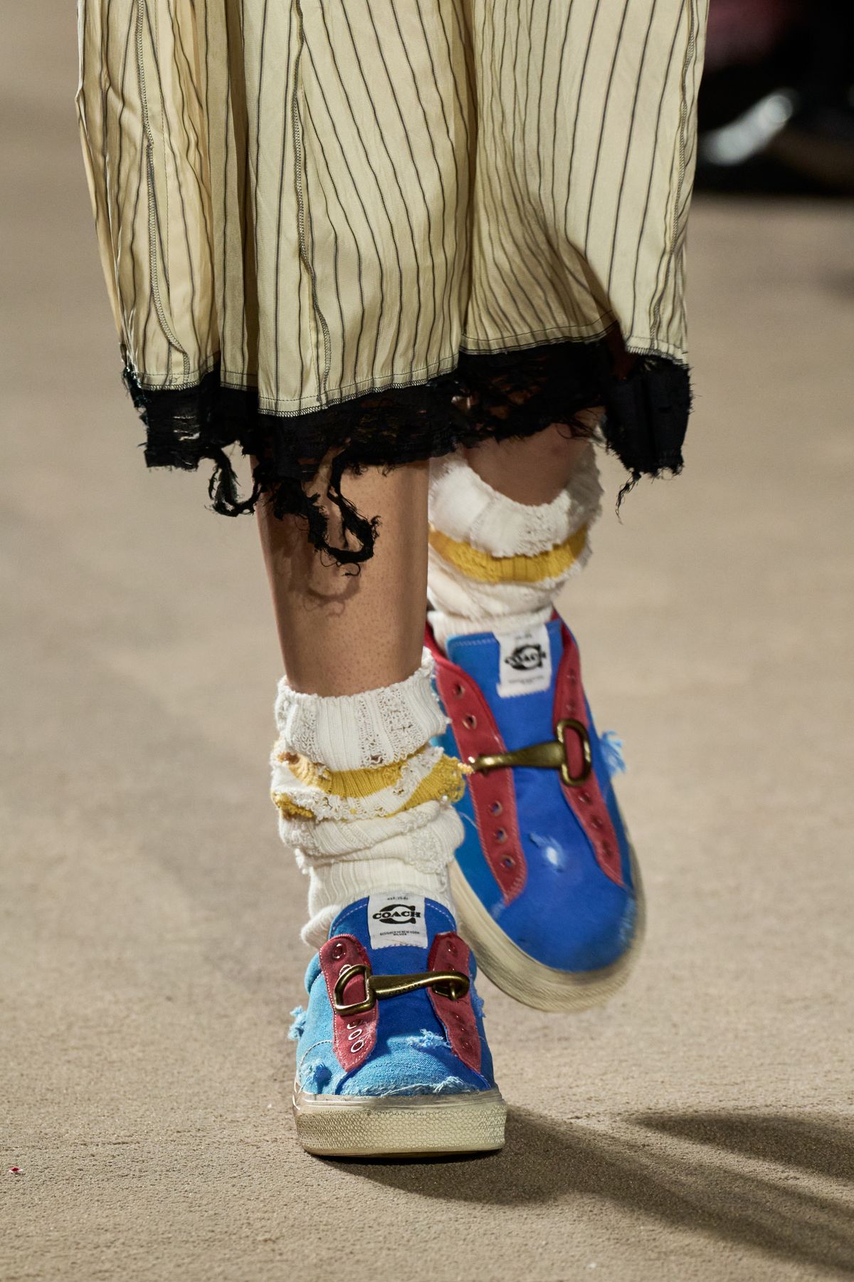 슈즈에서는 레이스 없이 완성된 ‘코치 스케이트 스니커즈(Coach Skate Sneakers)’가 주목할 만하다. 70년대 스웨이드와 캔버스에서 영감을 받아, 모노톤부터 대비 컬러까지 폭넓은 팔레트로 구성됐다. 하드웨어 클립이 시그니처 디테일로 자리한다. 액세서리는 별·달·태양의 천체 모티프가 중심. 골드와 실버 톤의 이어링과 브로치, 타이거아이 시그넷 링이 체인 목걸이로 변주된다. 컬러풀한 레더 벨트, 바시티 스트라이프 삭스, 얇은 실버 프레임 안경이 룩을 마무리한다.