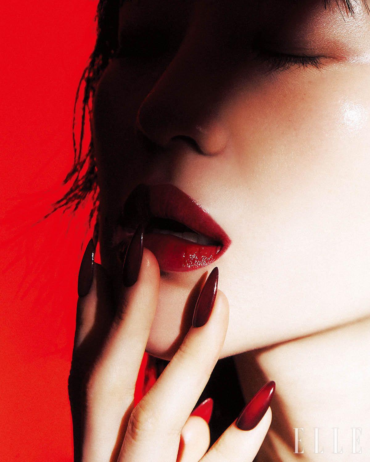 」얼굴 위에 드리운 그림자 아래 입술을 가득 채운 짙은 레드 컬러가 시선을 붙잡는다. Shiseido 리바이탈에센스 스킨 글로우 파운데이션, 130 오팔로 깨끗한 광채를 머금은 피부를 연출한 뒤, 차분한 음영을 선사하는 M∙A∙C 아이섀도우, 소바를 눈두덩부터 언더라인까지 자연스럽게 연결하듯 터치해 깊이를 더한다. 이 룩의 ‘킥’인 글로시 레드 립은 Byredo 리퀴드 립스틱 바이닐, 359 스칼렛 리버를 입술 윤곽을 따라 섬세하게 채워 완성한 것. 마지막으로 스틸레토 셰이프 네일 위에 선명한 붉은빛을 띤 Chanel 르 베르니, 153 품피에를 베이스로 바르고 ‘딥’한 블랙 컬러의 161 르 디아블롱 샤넬을 스펀지에 묻혀 외곽에만 터치해 그러데이션하듯 블렌딩한다.