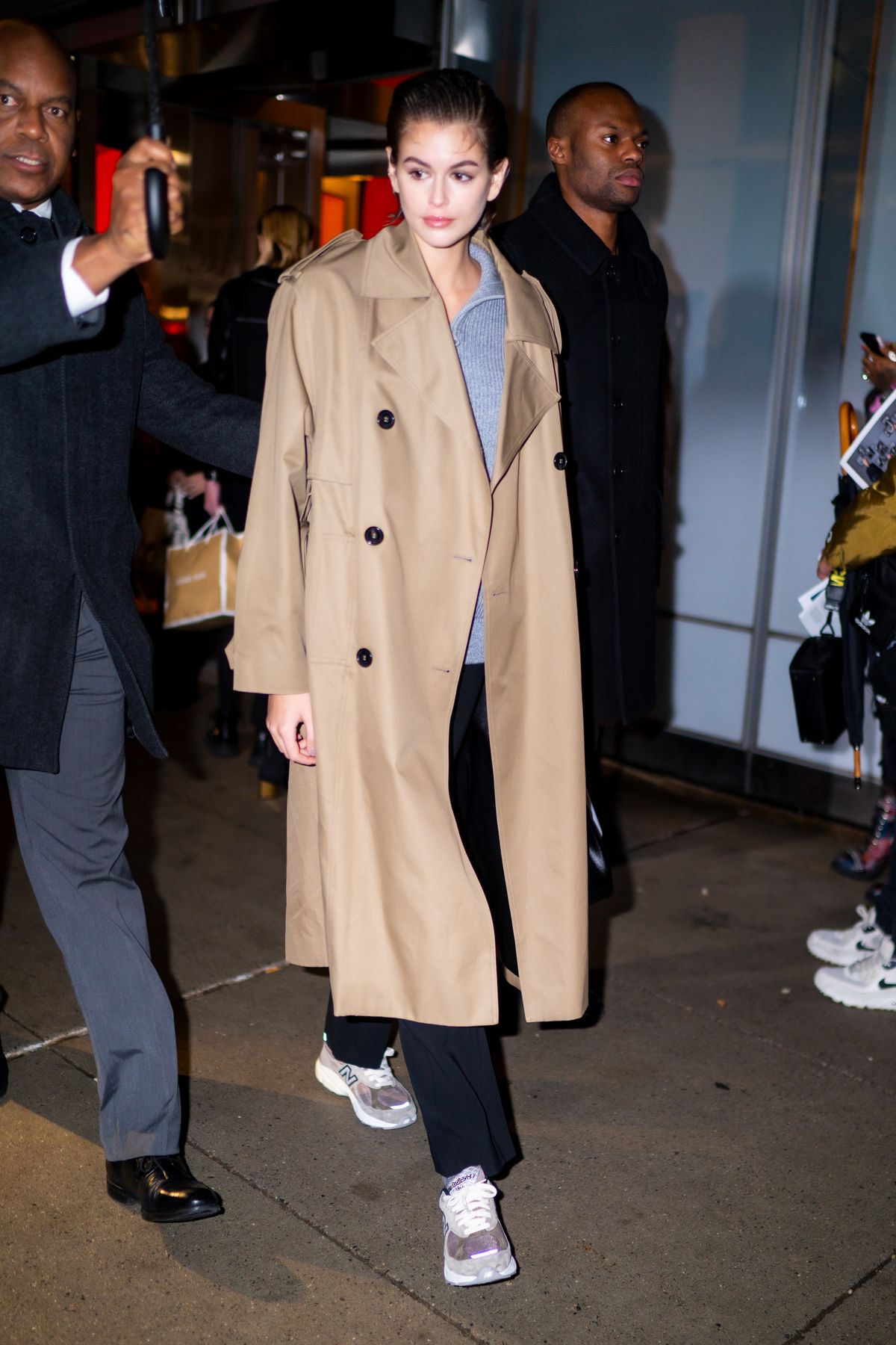 최근 스트리트 스타일에서 가장 자주 등장하는 간절기 아우터는 단연 트렌치코트입니다. 특히 카이아 거버처럼 오버사이즈 실루엣을 선택하면 훨씬 자연스러운 분위기가 완성되죠. 공항이나 이동이 많은 여행 날에는 애슬레저 룩 위에 트렌치코트를 가볍게 걸치는 방식이 가장 실용적입니다. 봄에는 크롭 트렌치가 유행하기도 하지만, 모델들의 오프듀티 스타일에서는 여전히 길고 넉넉한 핏의 코트가 더 자주 등장하죠. 자연스럽고 여유로운 실루엣이 모델 특유의 무심한 분위기를 만들어주는 데에 제격이기 때문입니다.