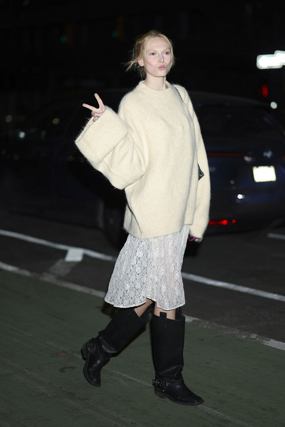 기본 아이템이라고 해서 반드시 얌전할 필요는 없습니다. 알렉스 콘사니의 스타일이 바로 그 예시죠. 그는 니하이 하네스 부츠와 오버사이즈 퍼지 니트를 즐겨 입습니다. 거친 그런지 무드의 아이템을 선택하되, 레이스나 시어 소재 같은 섬세한 디테일을 함께 매치해 스타일의 균형을 맞추는 편이죠. 강한 아이템과 부드러운 소재를 섞는 방식은 간절기 스타일링에서 특히 효과적인 방법이니 참고해보세요.
