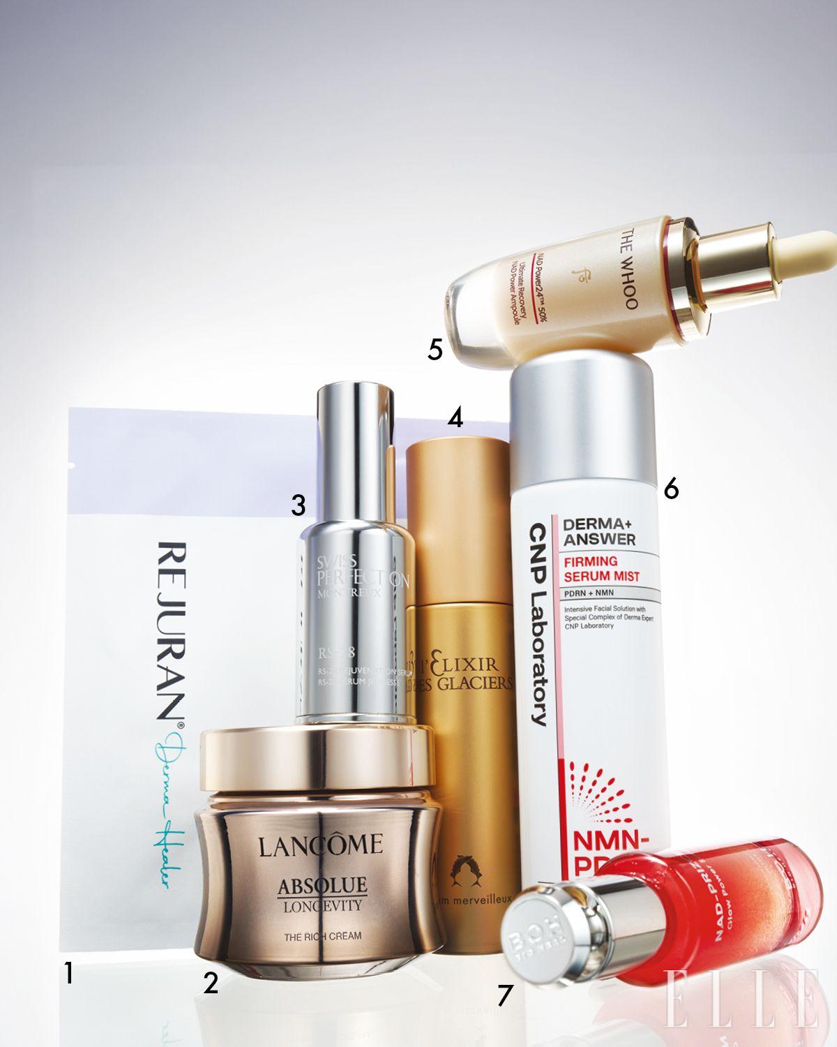 1 해양 생물의 DNA에서 얻은 c-PDRN과 콜라겐을 함유한 젤 타입의 마스크 팩. 더마 힐러 포어 타이트닝 겔 마스크 32g x 5매, 3만5천원대, Rejuran Cosmetics. 2 장미로부터 추출한 압솔뤼 PDRN™ 성분과 피부 장벽을 개선하는 오일이 피부의 턴오버 주기를 촉진해 한층 촘촘하고 밀도 있는 피부로 만들어주는 압솔뤼 롱지비티 더 리치 크림, 57만원대, Lancôme. 3 아이리스에서 추출한 엑소좀과 손상된 세포를 복구하는 NAD+ 부스터, 효모 추출물이 피부 재생 주기를 활성화한다. RS-28 리주베네이션 세럼 2세대, 52만5천원대, Swiss Perfection. 4 철갑상어에서 추출한 DNA 성분을 이중 정제해 한층 섬세하고 순도 높은 포뮬러를 완성했다. 세럼 메르베이유, 1백42만원대, Valmont. 5 세포 재생에 관여하는 NAD를 피부에 흡수시키는 특허 성분을 담아 피부 노화를 지연한다. 피부 탄력과 보습, 결에 이르기까지 고르게 개선해 주는 비첩 자생 NAD 파워 앰풀, 12만원, The Whoo. 6 노화 완화 인자인 NAD+의 전구체, 모공보다 4000배 작은 크기의 PDRN, 피부 탄력을 개선하는 여섯 종의 바이옴 컴플렉스를 함유해 피부 컨디션을 즉각적으로 끌어올리는 더마앤서 퍼밍 세럼 미스트, 1만8천원, CNP Laboratory. 7 2000개 이상의 고순도 NAD 캡슐을 함유해 칙칙하고 푸석푸석한 피부에 생기를 더해준다. 글루타치온과 나이아신아마이드가 피부 투명도를 올려주는 NAD 프리즈셀 글로우 파워 세럼, 3만9천원, Bio Heal Boh.