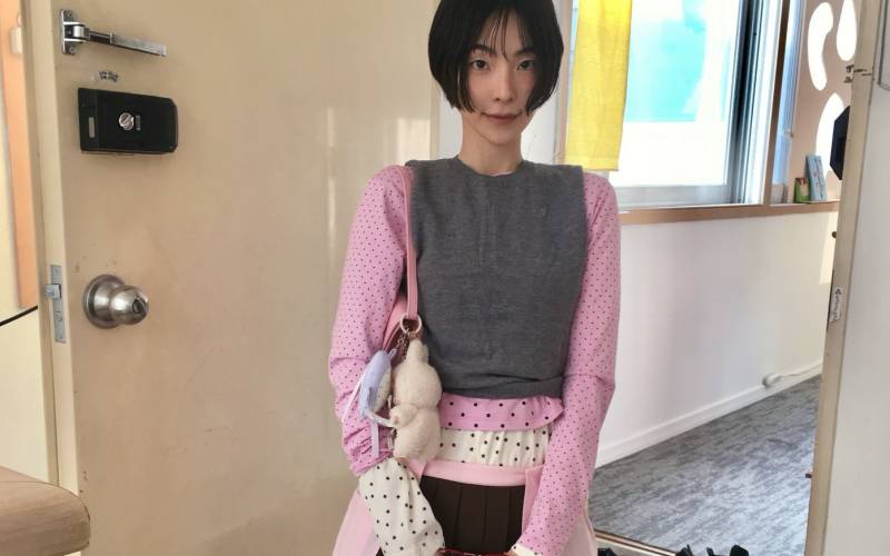 백예린 특유의 빈티지한 감성이 물씬 풍기는 원피스 룩입니다. 빛바랜 듯한 색감과 유니크한 패턴이 돋보이는 타이트한 미니 원피스만으로도 시선이 가지만, 이 룩에서 특히 참고하면 좋을 포인트는 허리에 둘러맨 볼드한 벨트인데요. 큼지막한 메탈 장식이 돋보이는 가죽 벨트가 하체의 시작점에 걸쳐지며 룩에 사랑스러운 반전을 선사하죠.