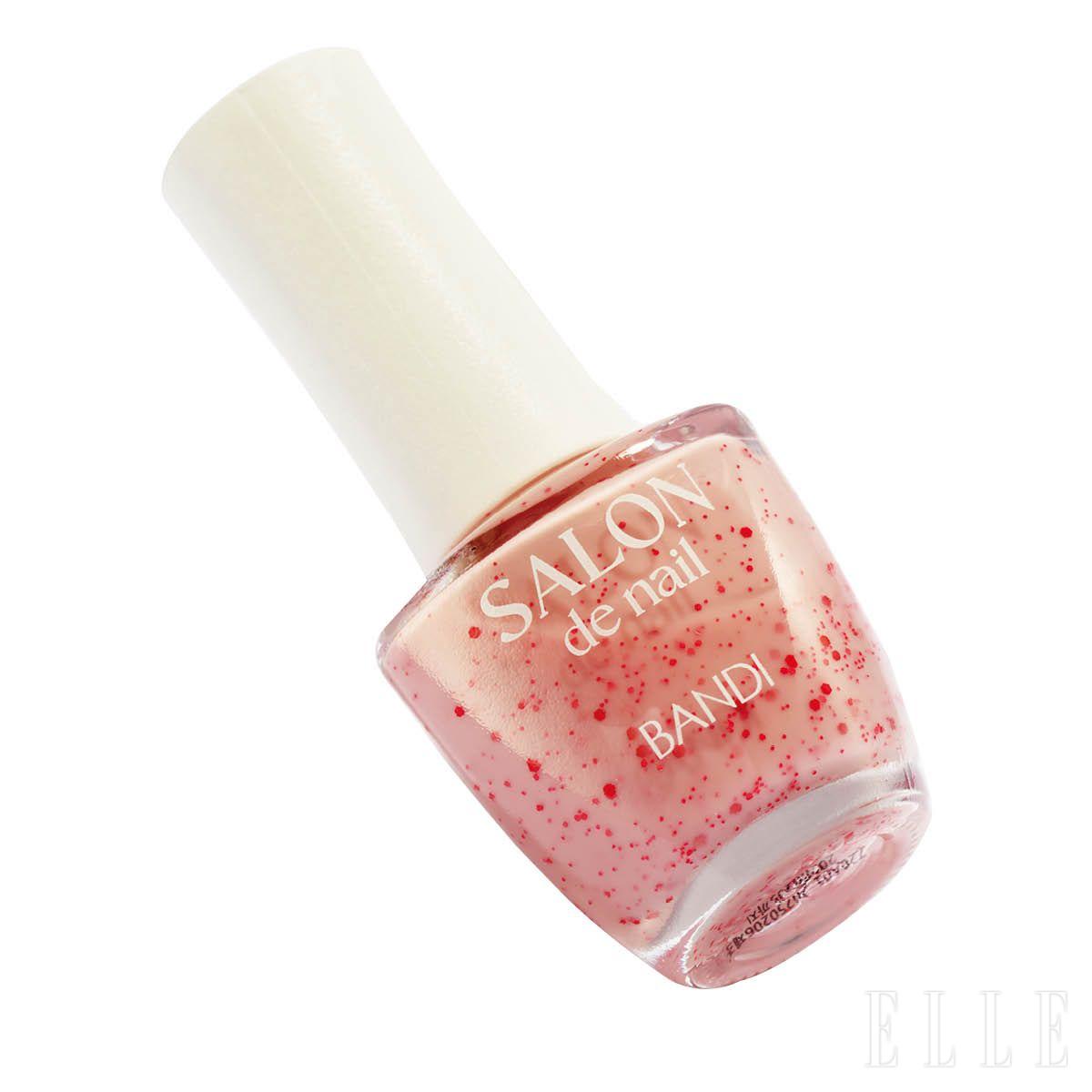 밀키한 핑크 베이스에 크고 작은 레드 글리터가 ‘콕콕’ 박혀 있다. U자 형태로 둥글게 퍼지는 브러시 덕분에 큐티클 라인을 따라 자연스럽게 발리는 살롱드네일, SG108 베리소르베, 1만2천원, Bandi.
