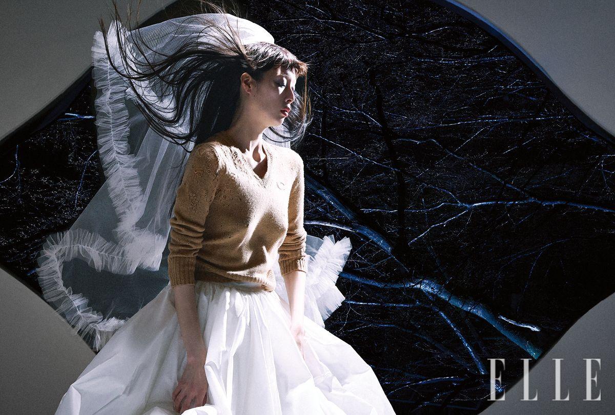 니트 톱은 가격 미정, Coach. 화이트 스커트와 베일은 가격 미정, 모두 Evenmore.