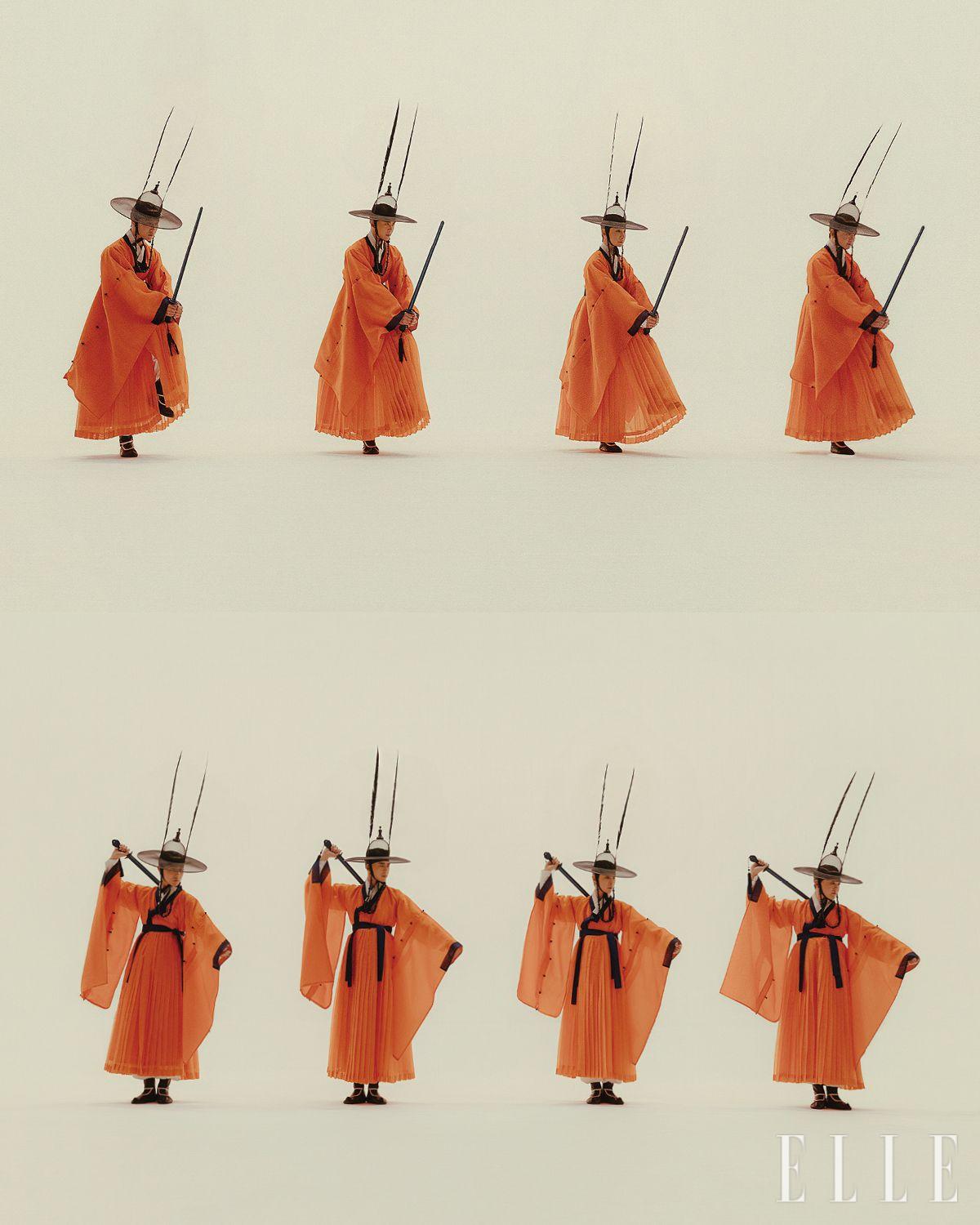 1막 일무연구 : ‘무무’ 오방색 대신 전통한복에선 흔히 사용하지 않는 서브 컬러인 주황색의 철릭을 착용해 검무의 강렬한 무드를 강조한다.