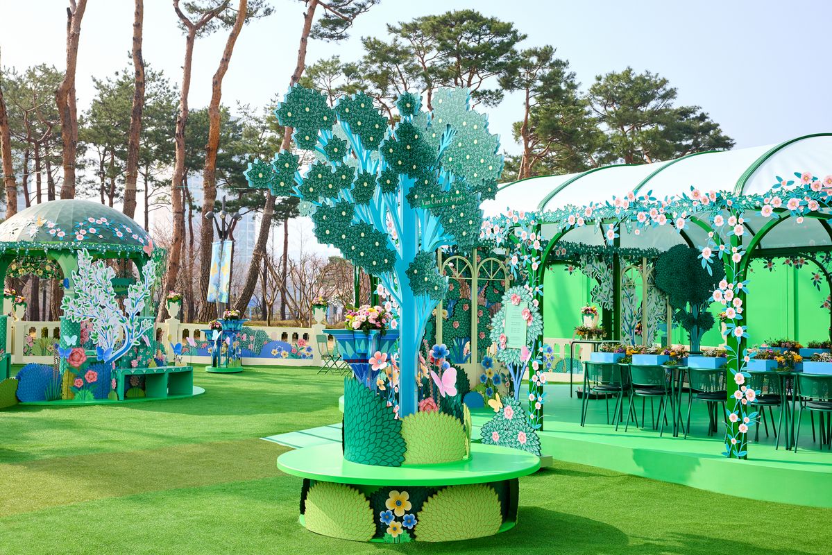 이번 프로젝트는 메종이 오랫동안 사랑해온 계절인 봄에 보내는 헌사입니다. 자연과 상상력이라는 브랜드의 핵심 모티프를 공간 전체에 풀어낸 것이 특징이죠. 반클리프 아펠의 팝업이 뭔가 다른 데에는 이유가 있습니다. 메종과 오래도록 협업해온 프랑스의 일러스트레이터 샬롯 가스토가 궁정 드레스 소재 중 하나인 실크에서 영감을 얻어 정원 전체를 파스텔 톤의 일러스트레이션으로 물들였기 때문이죠.