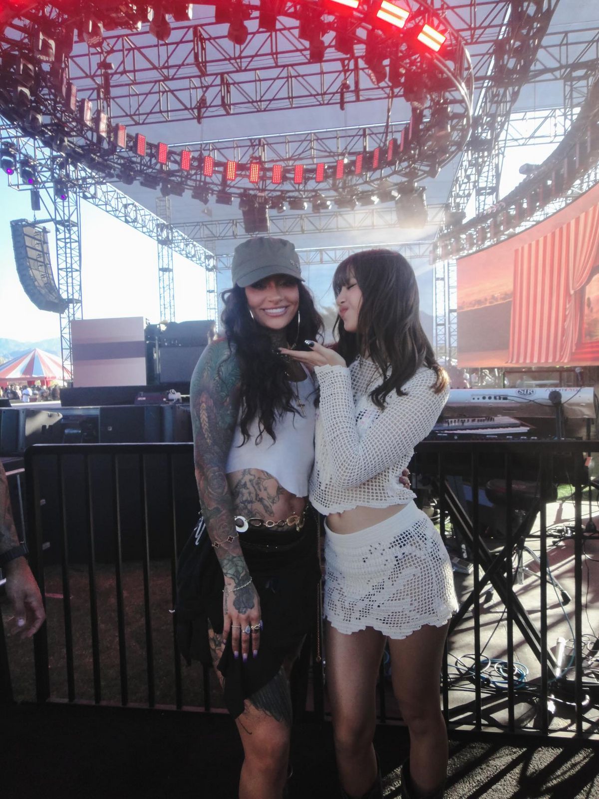 리볼브 페스티벌 무대를 핫하게 장악한 것은 물론, 코첼라 본 무대에서 기브온의 스페셜 게스트로 깜짝 등장한 싱어송라이터 켈라니는 리사와 함께 다정한 투샷을 업로드했습니다. 리사는 청량한 화이트 컬러의 크로셰 톱과 스커트를 매치해 페스티벌 룩의 정석 같은 스타일을 선보였죠. 여기에 화려한 프린트의 수영복을 이너로 매치해 네트 소재 사이로 은근하게 비치는 대담한 레이어링으로 자유분방한 무드를 한껏 끌어올렸습니다.