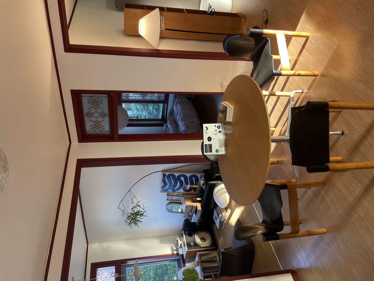 현관에서 들어오면 바로 보이는 거실에는 원형 식탁과 음악을 들을 수 있는 오디오 공간이 있고, 안쪽으로 들어가면 주방이 나와요. 둘이 살기에 넓지도, 좁지도 않은 딱 좋은 크기라고 생각해요.