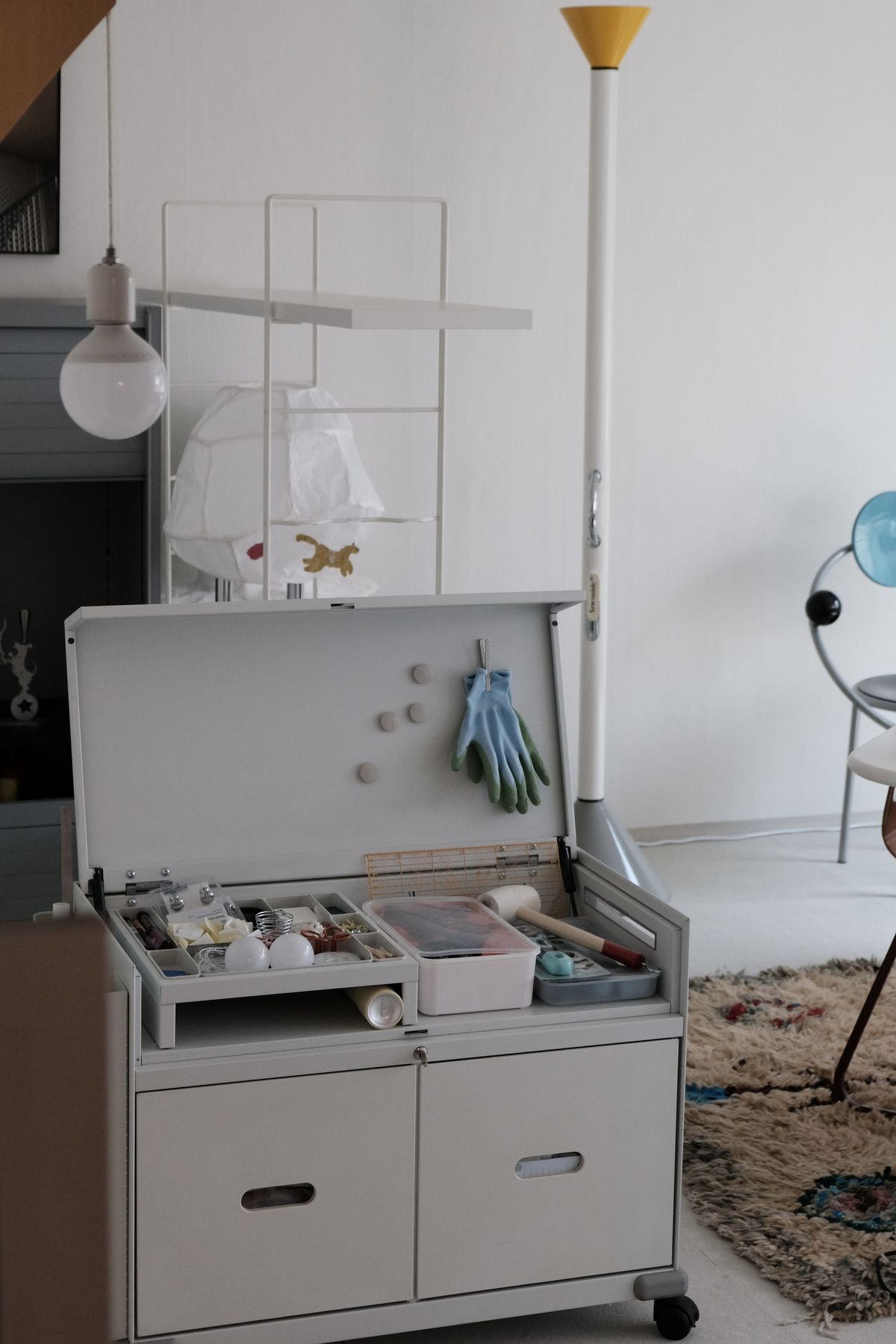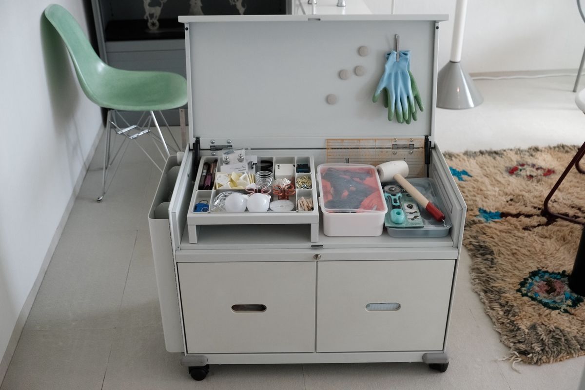 원래는 사무용으로 나온 제품인데 뚜껑을 닫으면 쿠션이 있어 의자처럼 앉을 수도 있고 지금은 만들기 할 때 필요한 공구와 부자재들로 꽉 채워져 있어