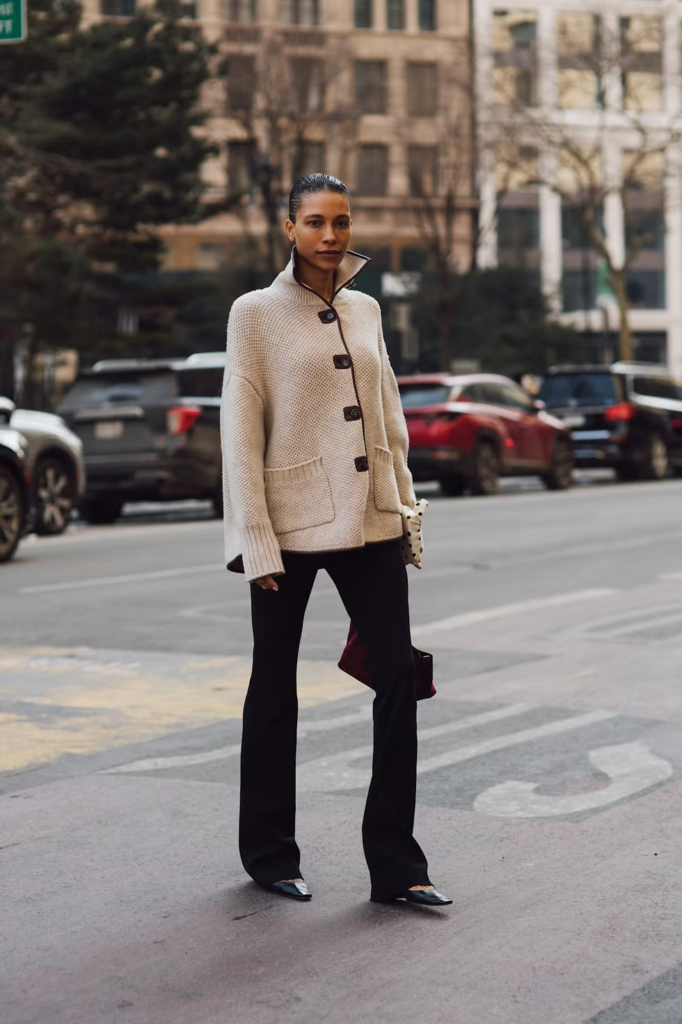 봄에 특히 잘 어울리는 스타일을 찾고 있다면 발레 플랫을 눈여겨봐야 합니다. 카디건과 부츠컷 진 그리고 광택감 있는 발레 플랫을 더한 조합은 '조용한 럭셔리'를 가장 잘 표방한 룩이죠. 단정하게 뒤로 묶은 번 헤어 스타일까지 더하면 한층 더 세련된 인상을 만들 수 있습니다. 여기에 스웨이드 소재의 핸드백과 실크 스카프를 매치하면 편안하면서도 완성도 높은 일상 스타일이 완성되고요.