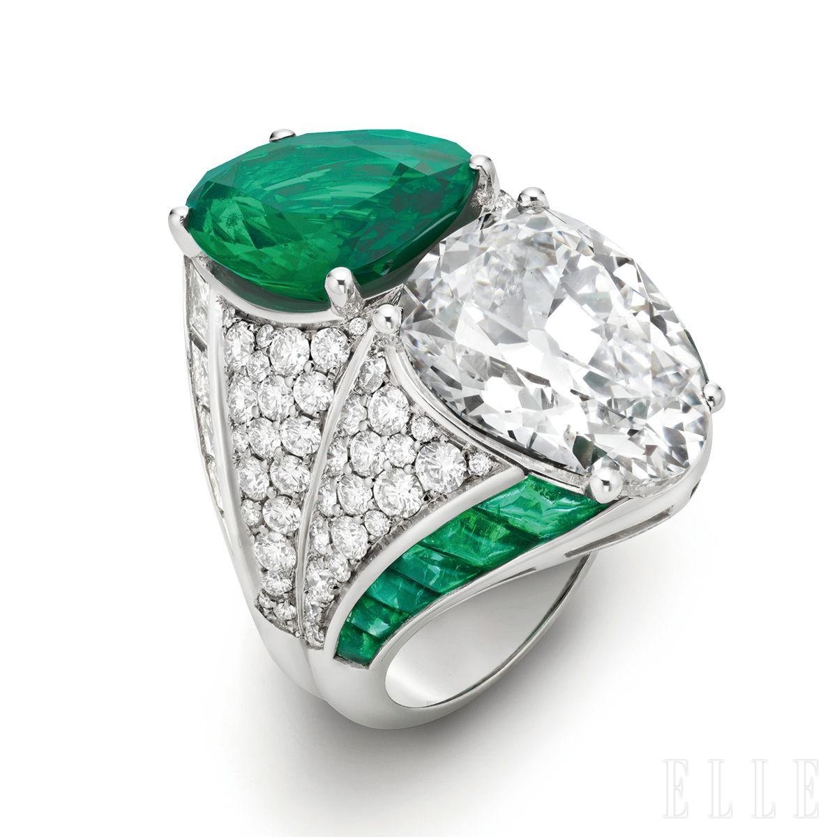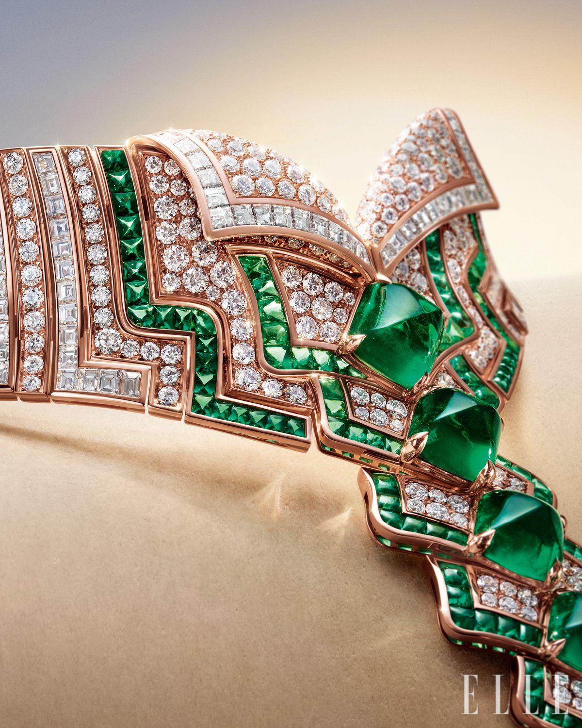 불가리의 시그너처인 투아 에 무아(Toi et Moi) 모티프를 결합의 상징으로 재해석했다. 7.85캐럿 앤티크 페어 셰이프 다이아몬드가 환한 광채를 발산하고, 맞은편의 5.42캐럿 콜롬비아산 에메랄드는 벨벳처럼 깊이 있는 색감을 보여준다.