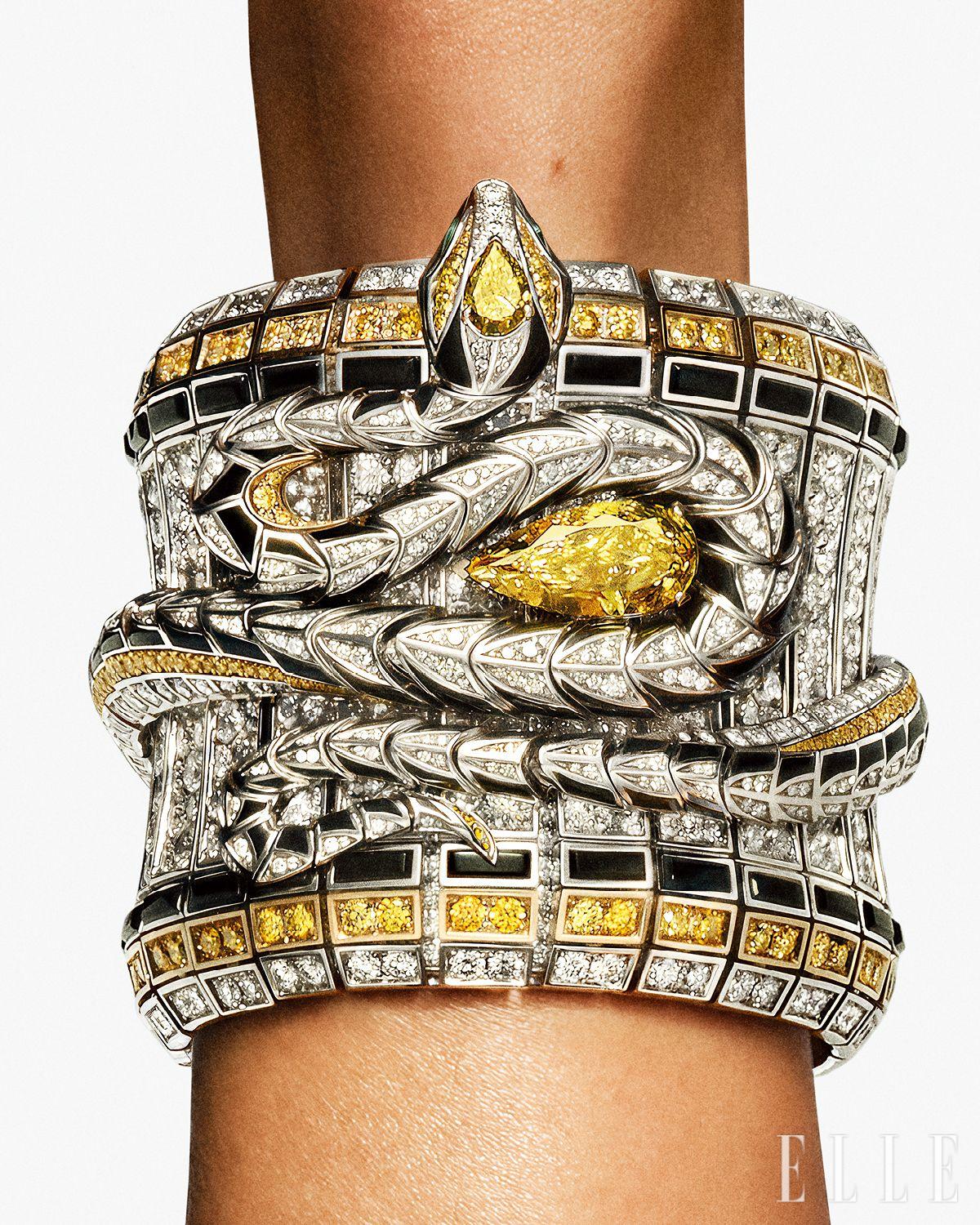 불가리 세르펜티를 한층 진화한 형태로 제시한다. 로마건축 기둥의 강렬함과 대칭 구조를 통해 잠금장치 없이 화이트골드 위에 선처럼 이어지는 뱀의 몸체를 구현했다. 중심에 5.08캐럿의 팬시 비비드 옐로 페어 컷 다이아몬드가 자리하고, 이를 둘러싼 다이아몬드와 오닉스 디테일, 헤드를 장식하는 또 다른 비비드 옐로 다이아몬드를 더해 빛의 대비를 극대화했다.