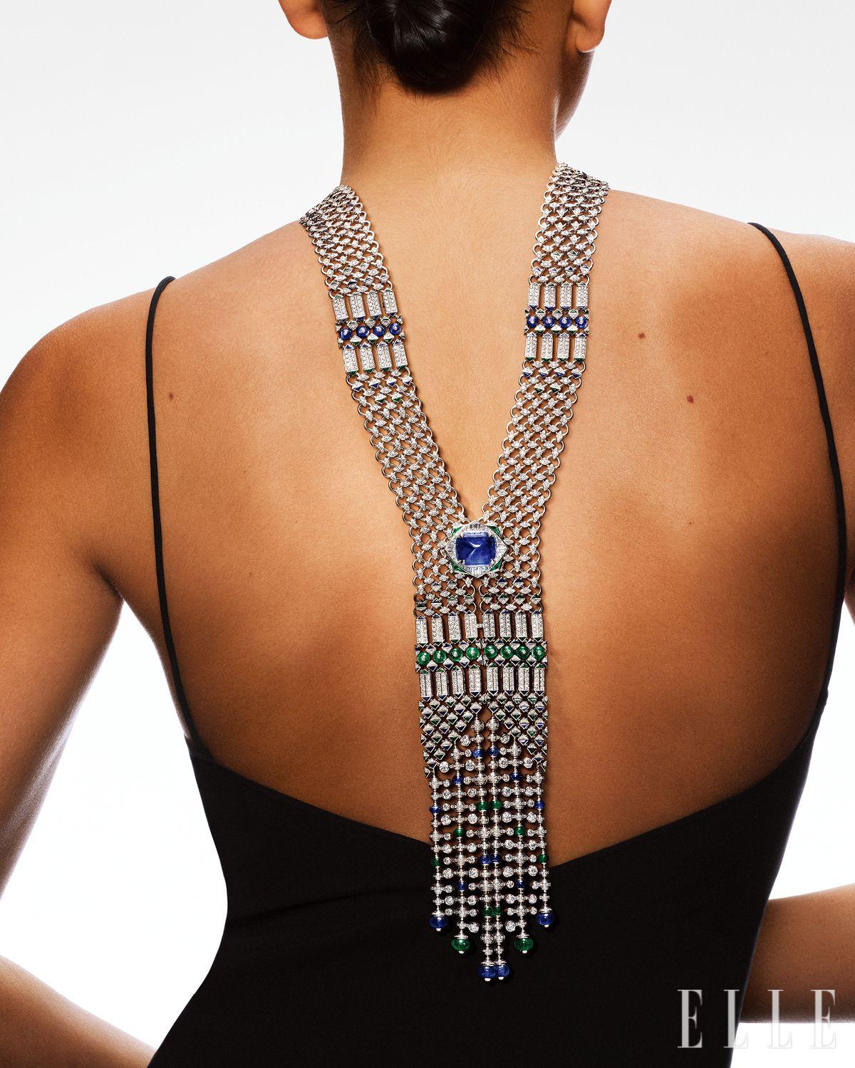 화이트골드 위에 기하학적으로 수놓은 다이아몬드와 에메랄드, 오닉스가 포인트가 되며 중심엔 14.01캐럿 마다가스카르산 앤티크 쿠션 컷 사파이어가 네크리스 전체를 견고히 지탱한다.
