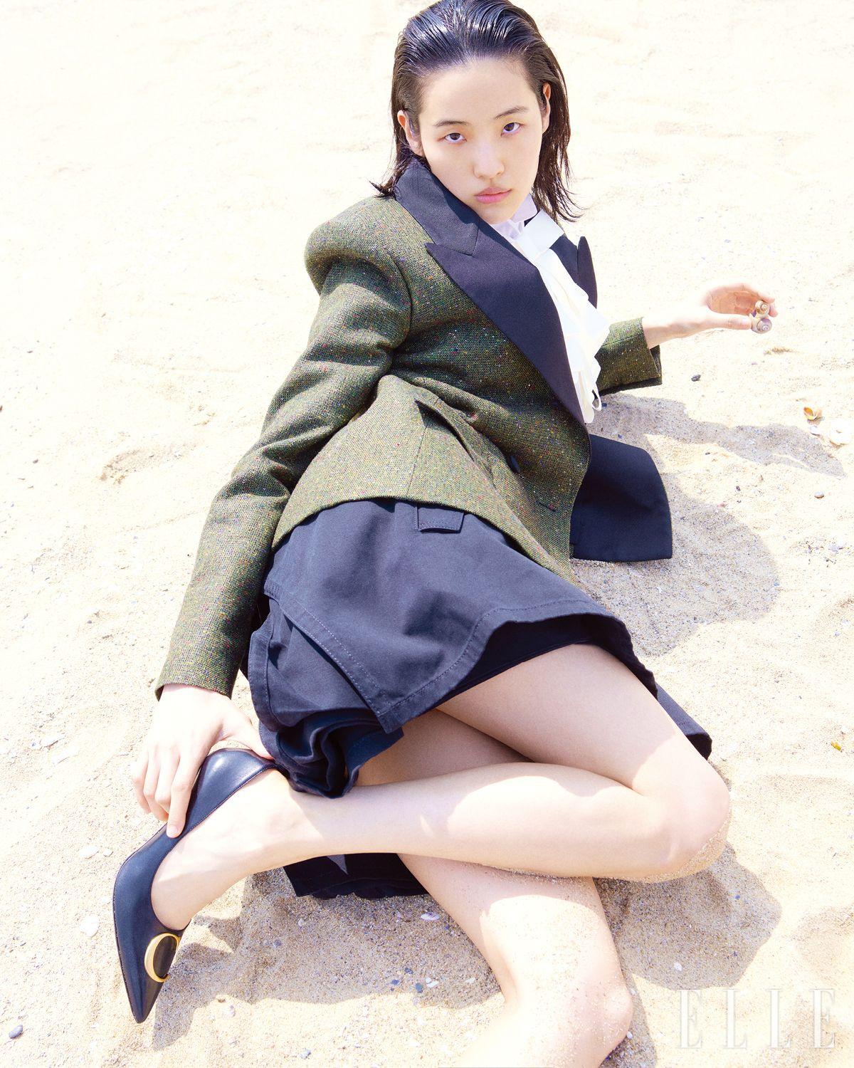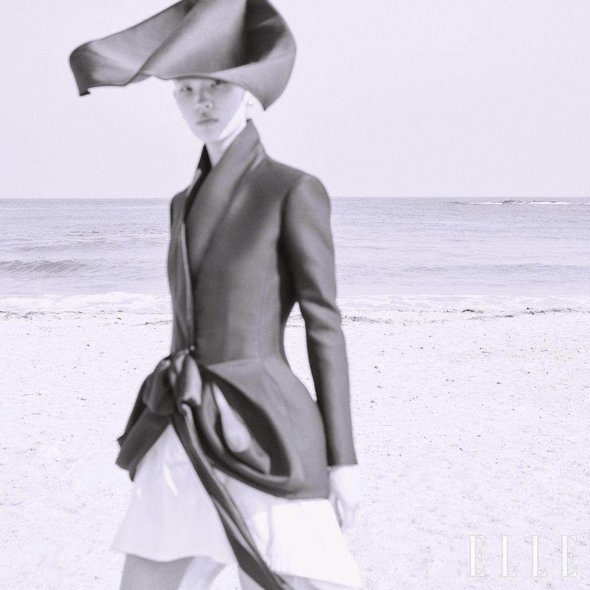 테일러드 턱시도 재킷과 포켓 디테일의 개버딘 미니스커트, 구조적인 실루엣의 모자, 이어링은 모두 Dior.