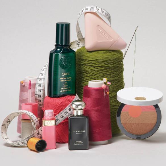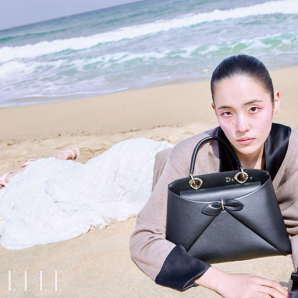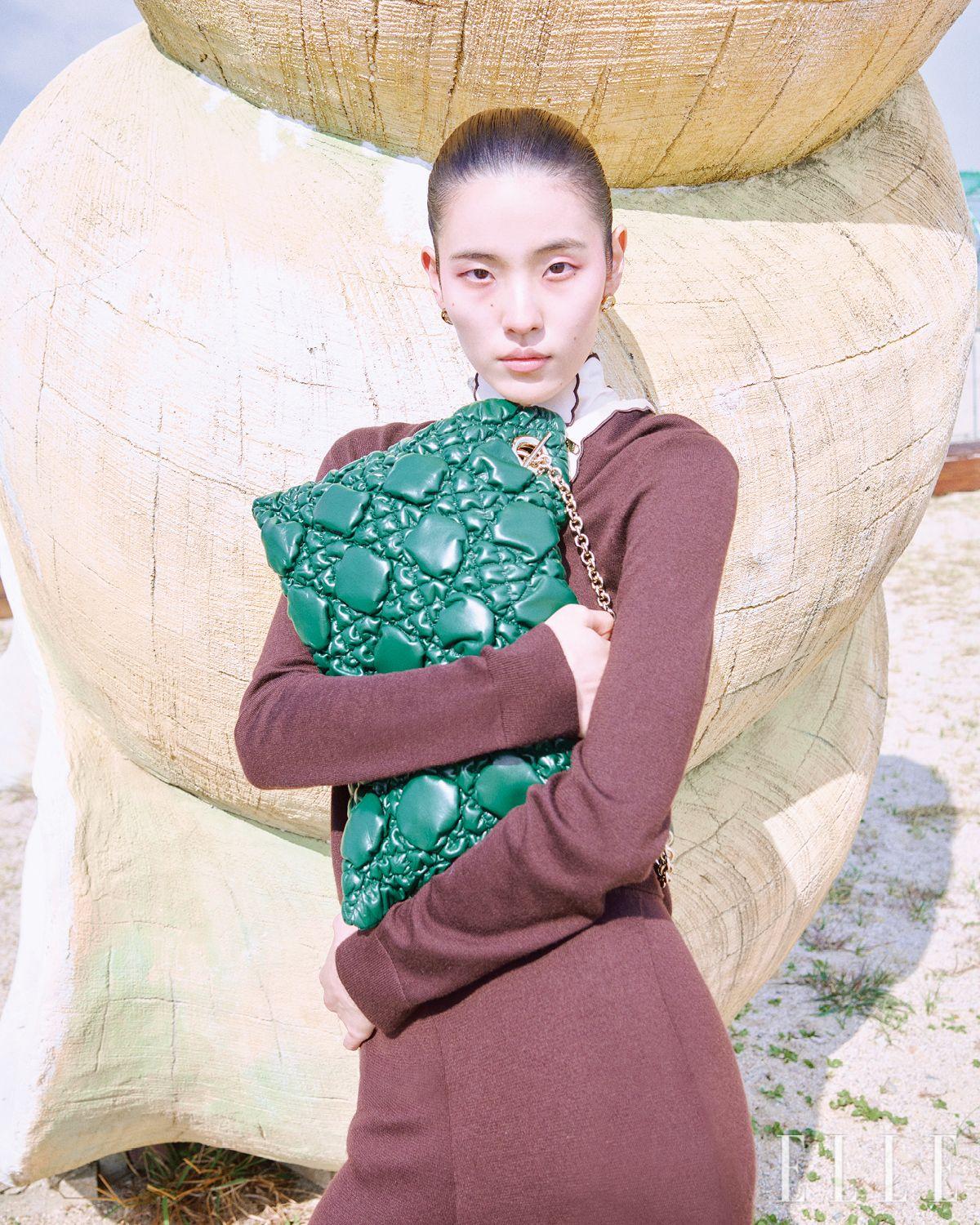 실크 셔츠 디테일의 캐시미어 니트 스웨터와 캐시미어 니트 팬츠, 입체적인 매트로까나쥬 소재로 제작한 디올 그런치(Dior Crunchy) 백, 이어링은 모두 Dior.